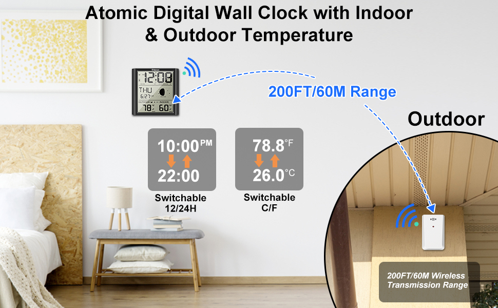 【ميزان حرارة رقمي داخلي وخارجي】ساعة ذرية رقمية مع وظيفة مراقبة درجة الحرارة، ينقل المستشعر الخارجي اللاسلكي (متضمن) درجة الحرارة الخارجية (درجة مئوية/درجة فهرنهايت اختيارية) إلى ساعة الحائط الرقمية الكبيرة. مما يعني أنه يمكنك وضعها داخل الفناء أو الفناء الخلفي أو الحديقة أو الفناء، ومراقبة الظروف الخارجية بسهولة دون الخروج.
