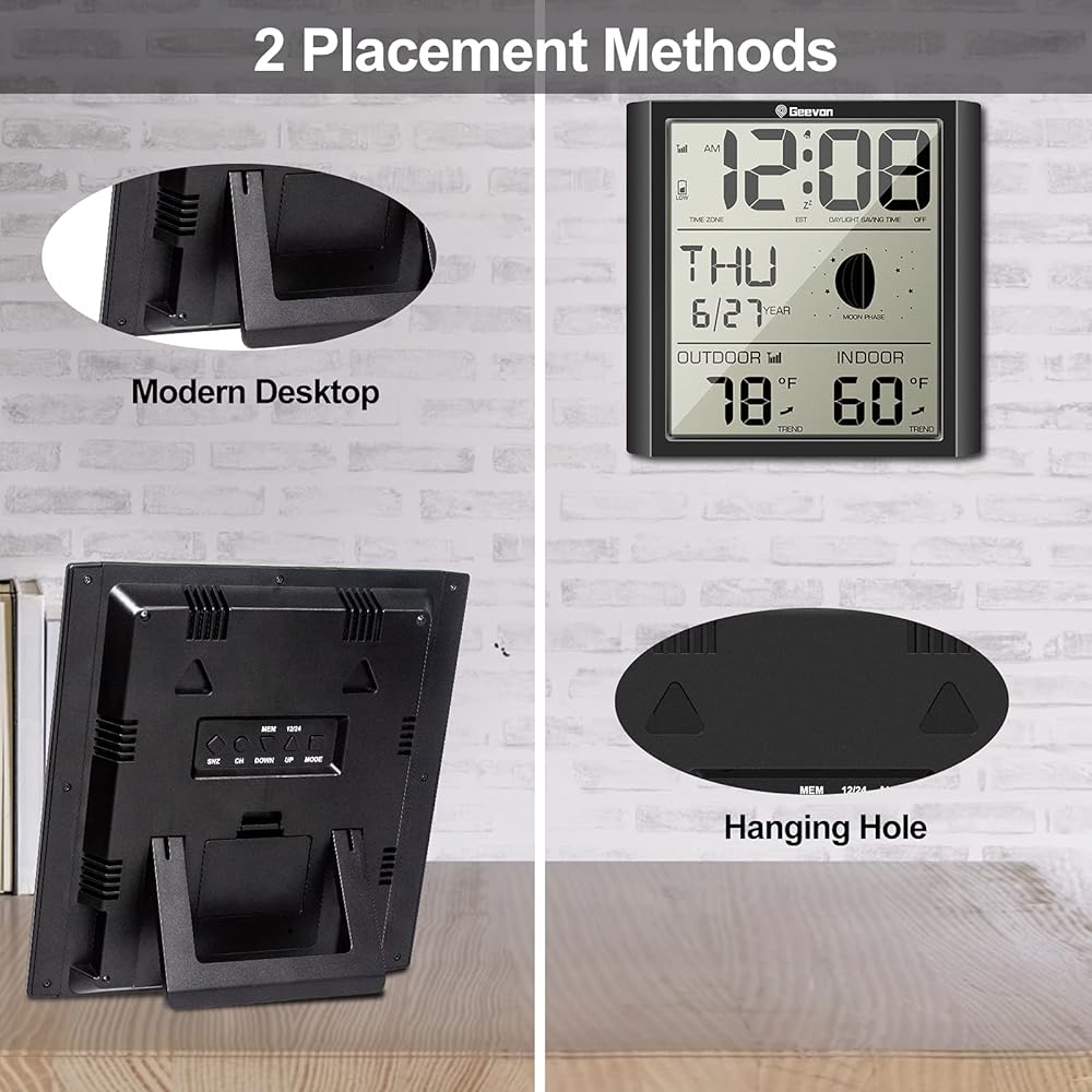 【استخدام واسع】تتميز ساعة محطة الطقس الخاصة بنا بفتحتين للتعليق ومسند لا يمكن وضعها على المنضدة فحسب، بل يمكن تعليقها أيضًا على الحائط. يمنحها إطار الساعة الجريء والبسيط مظهرًا عصريًا مع شعور كلاسيكي. مثالية لأي غرفة في المنزل أو المكتب أو غرفة النوم أو الخزانة أو الفصل الدراسي أو غرفة المعيشة.