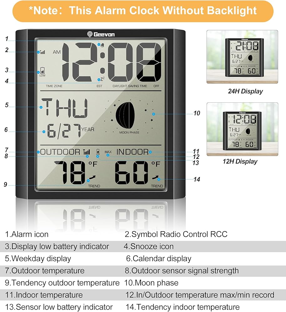 【تقنية الساعة الذرية المحسنة】ستكون ساعات الطقس الذري ذات درجة الحرارة الداخلية والخارجية دقيقة دائمًا في غضون ثانية واحدة حيث تتلقى تحديثات WWVB اليومية، ما عليك سوى اختيار المنطقة الزمنية الخاصة بك على أزرار إعداد الساعة وتشغيل التوقيت الصيفي إذا كان ذلك ممكنًا. تحديثات تلقائية للوقت النهاري، أيام الأسبوع، اليوم، الشهر، الوقت، تساعدك على إدارة الحياة العادية.