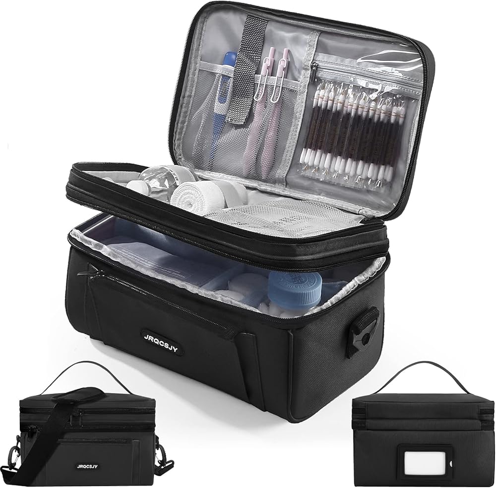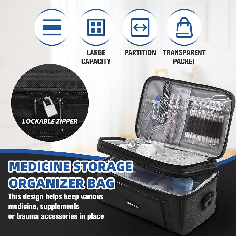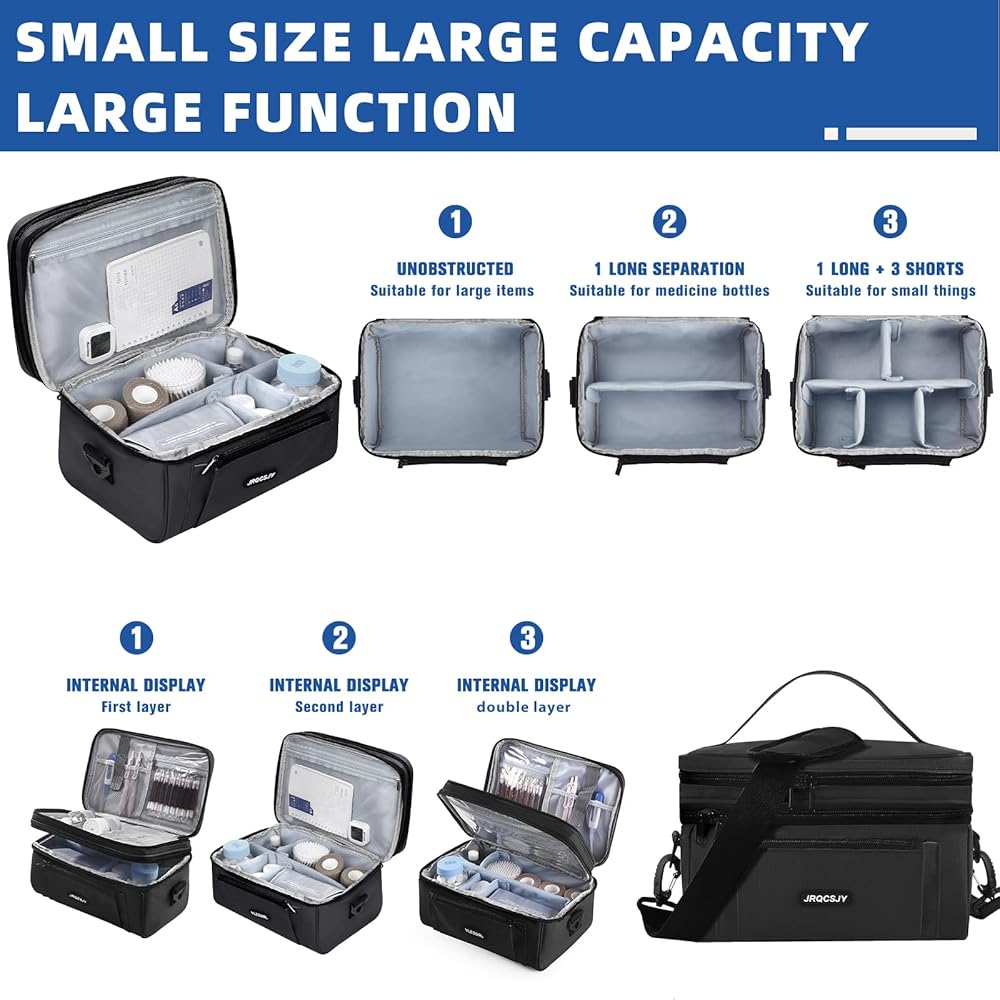 حجرات مزدوجة الطبقات: تتميز الطبقة السفلية من الحقيبة بسعة كبيرة وتأتي مع فواصل واحدة طويلة و3 فواصل قصيرة قابلة للتثبيت تسمح لك بالتعديل حسب الحاجة لتنظيم حبوب الدواء والزجاجات بشكل أفضل. يوجد 3 جيوب مستقلة و4 أحزمة في الطبقة العلوية، مما يحافظ على الأدوية المختلفة بطريقة منظمة.