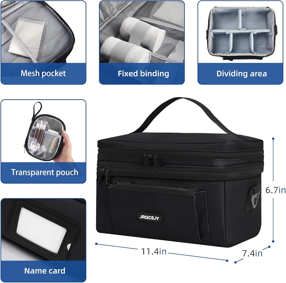 مقاس مثالي: 11.4 × 7.4 × 6.7 انش. تحتوي حقيبة تنظيم زجاجات الدواء مزدوجة الطبقات على جيوب تخزين متعددة يمكنها تخزين معظم مستلزمات الإسعافات الأولية والحفاظ عليها مرتبة. مثالي للسفر أو كصندوق تخزين للأدوية في المنزل.