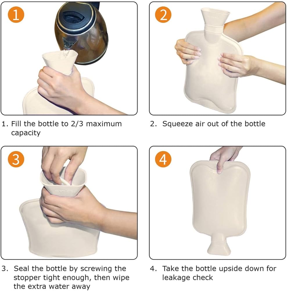 【Easy to Use】Our warm water bottle with wide mouth design, prevents you from being scalded when pouring water.First open the cap, allow boiling water to cool slightly before pouring( Do not use boiling water, About 80°C). Grab the neck of hot water bottle. Fill in water slowly up to 2/3 full. Press the residual air out slowly and tighten on the screw cap. Make sure there are no leaks before using.