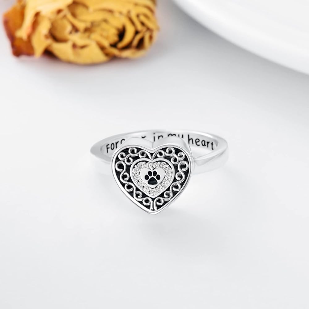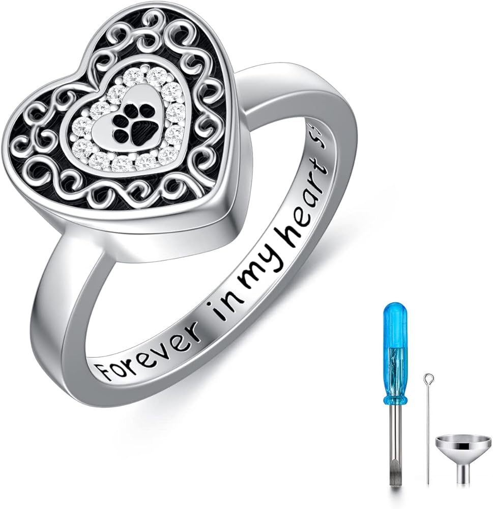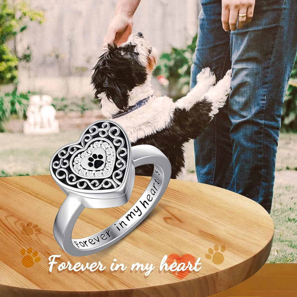 مفهوم التصميم - مجموعة حلقات الجرة المصنوعة من الفضة الإسترلينية تجلب الابتكار لهذه المجوهرات التذكارية. محاط بحجر الزركونيا المكعب، توجد طبعة قدم رائعة لكلبك أو قطتك الأليف، مع نقش "Forever in My Heart" في الخلف. هدية عظيمة لمحبي الكلاب أو أي محبي الحيوانات الأليفة.