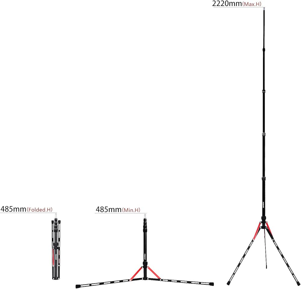 • ارتفاع مطوي 19 انش/485 ملم، ارتفاع قابل للتعديل يتراوح من 19 انش/485 ملم إلى 87 انش/220 ملم، أقصى سعة تحميل 10 باوند، قابل للتعديل للعديد من حالات الإضاءة.
