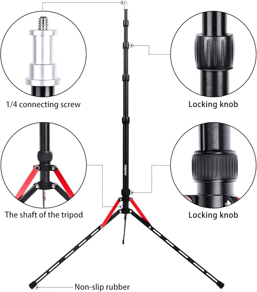 • حامل ضوء قياسي للاستخدام مع أي رأس ضوء، رأس برغي 1/4 على الجذع، يدعم معظم معدات الصور مثل الإضاءة الحلقية، حامل الهاتف ، كاميرا دي اس ال ار، العاكس، الصندوق الناعم، المصابيح المختلفة، المظلة، إلخ.