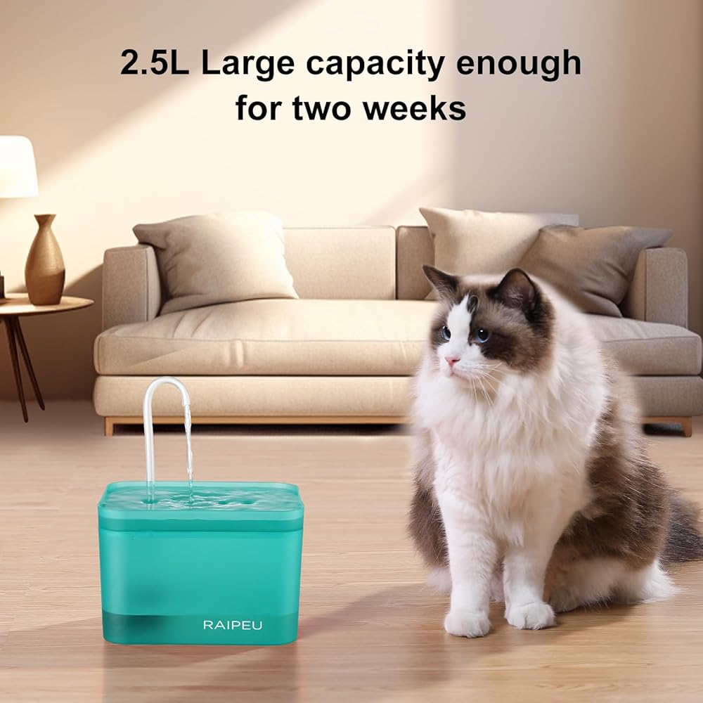 سعة واسعة: بسعة كبيرة تبلغ 2.5 لتر، تتطلب نافورة القطط الخاصة بنا عبوات أقل، مما يجعلها مريحة لك ولقطتك. اقضي وقتًا أقل في ملء الوعاء ووقتًا أكثر جودة مع حيوانك الأليف.