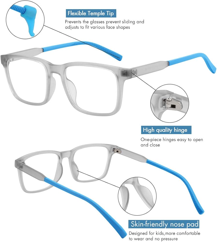 نظارات مرنة ومنحنية فاخرة: تم تصميم هذه النظارات مع وضع الأطفال في الاعتبار. إطارات TR90 تجعلها مريحة للغاية وخفيفة الوزن عند ارتدائها لفترات طويلة من الوقت. إنها مقاومة للصدمات ويمكن لفها وثنيها دون أن تنكسر. أغطية قدم المعبد عالية الجودة تزيد من الاحتكاك وتمنع الانزلاق.