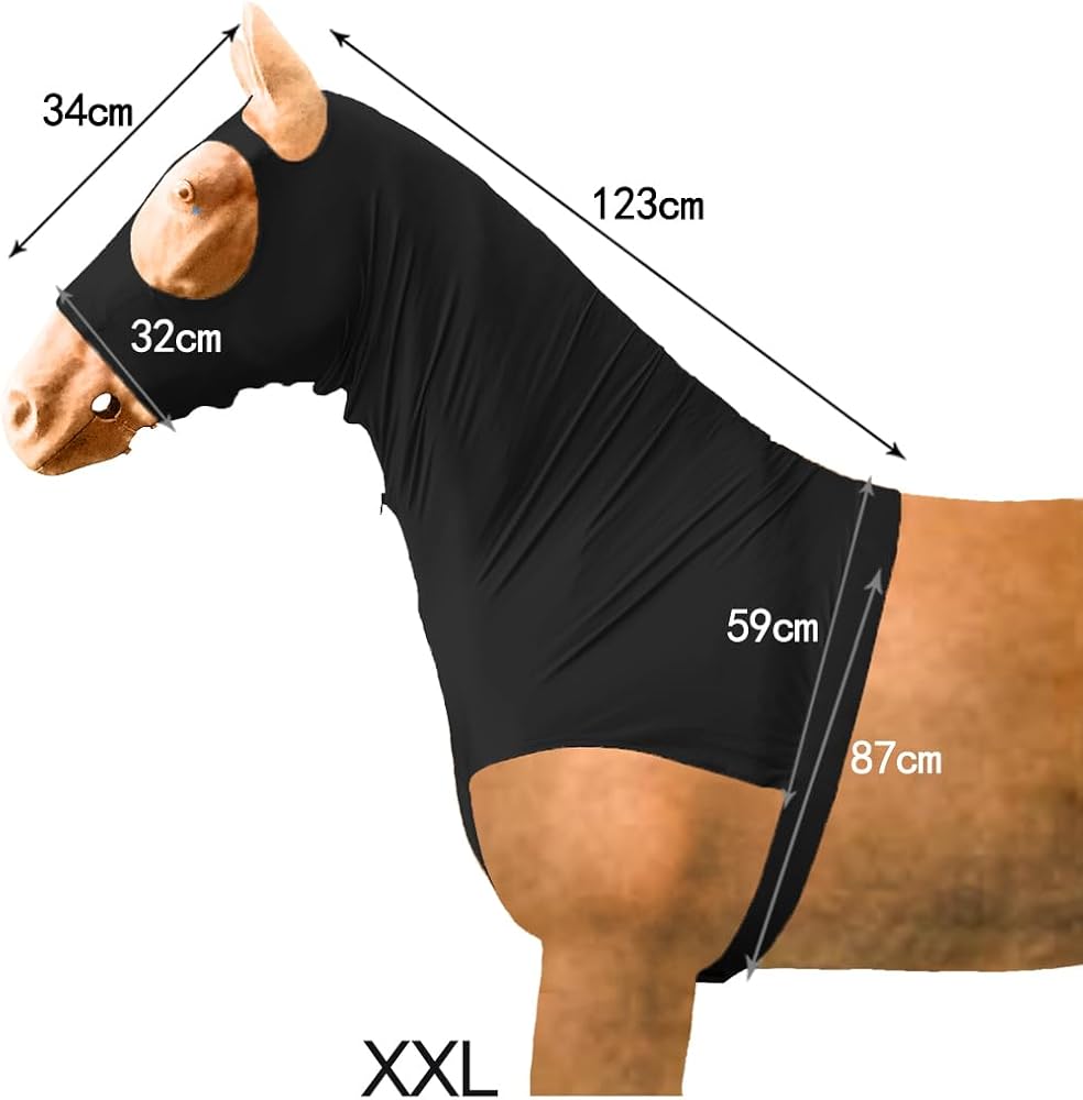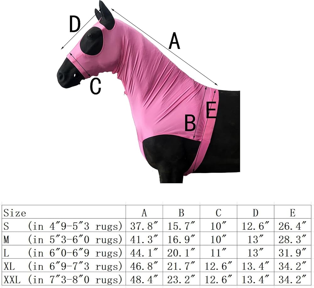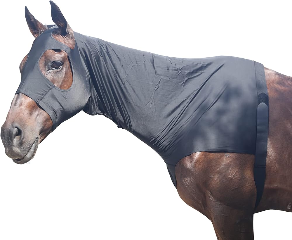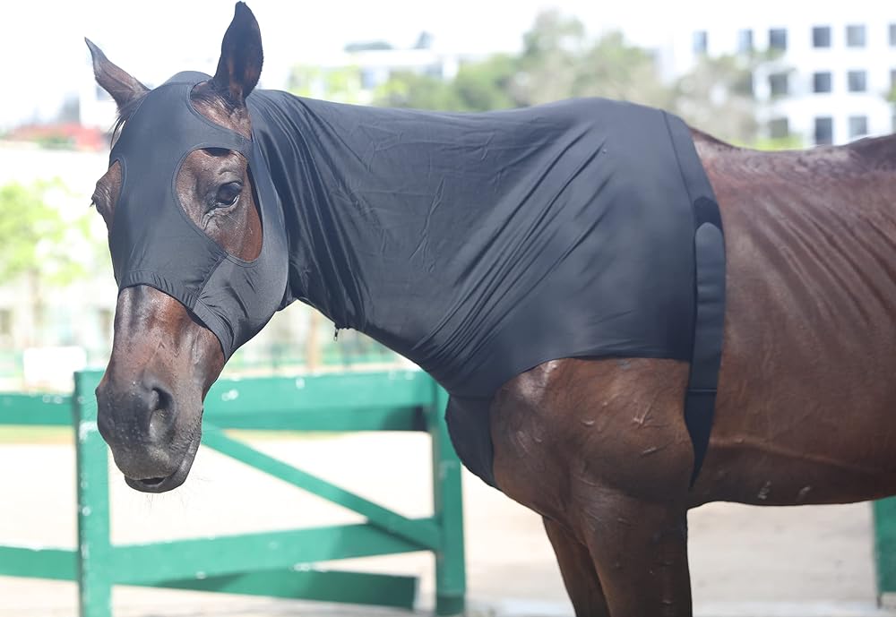 غطاء رأس حصان من الليكرا القوي وجيد التهوية المزود بسحاب رائع بمفرده أو تحت بطانية، ويحمي من أشعة الشمس المباشرة والحشرات.