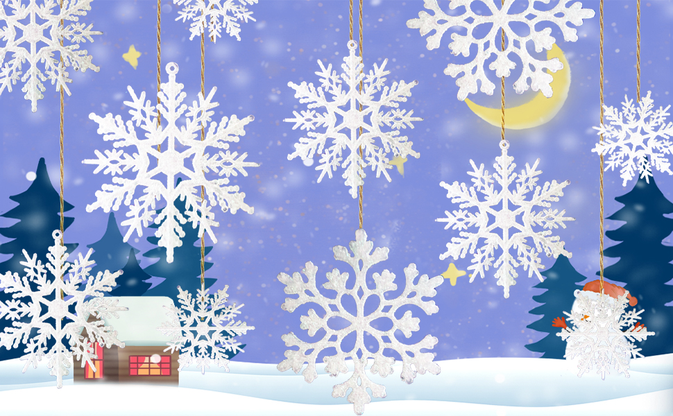 ❄️زينة مثالية لعيد الميلاد: تأتي كل عبوة مع خيوط لتعليق ندفات الثلج. ندفات الثلج البلاستيكية هي منتج لطيف بالنسبة لك لتزيين الحرف اليدوية اليومية، بما في ذلك اصنعها بنفسك وأكاليل الزهور وإكليل الزهور والهدايا ورجال الثلج. مثالية لتزيين حفلات عطلة الكريسماس