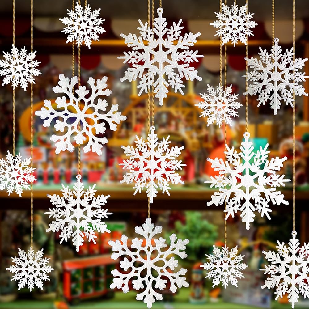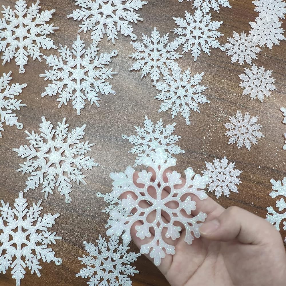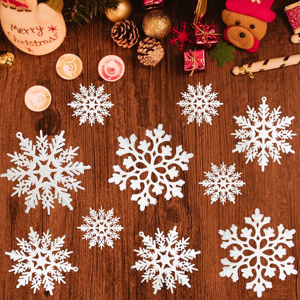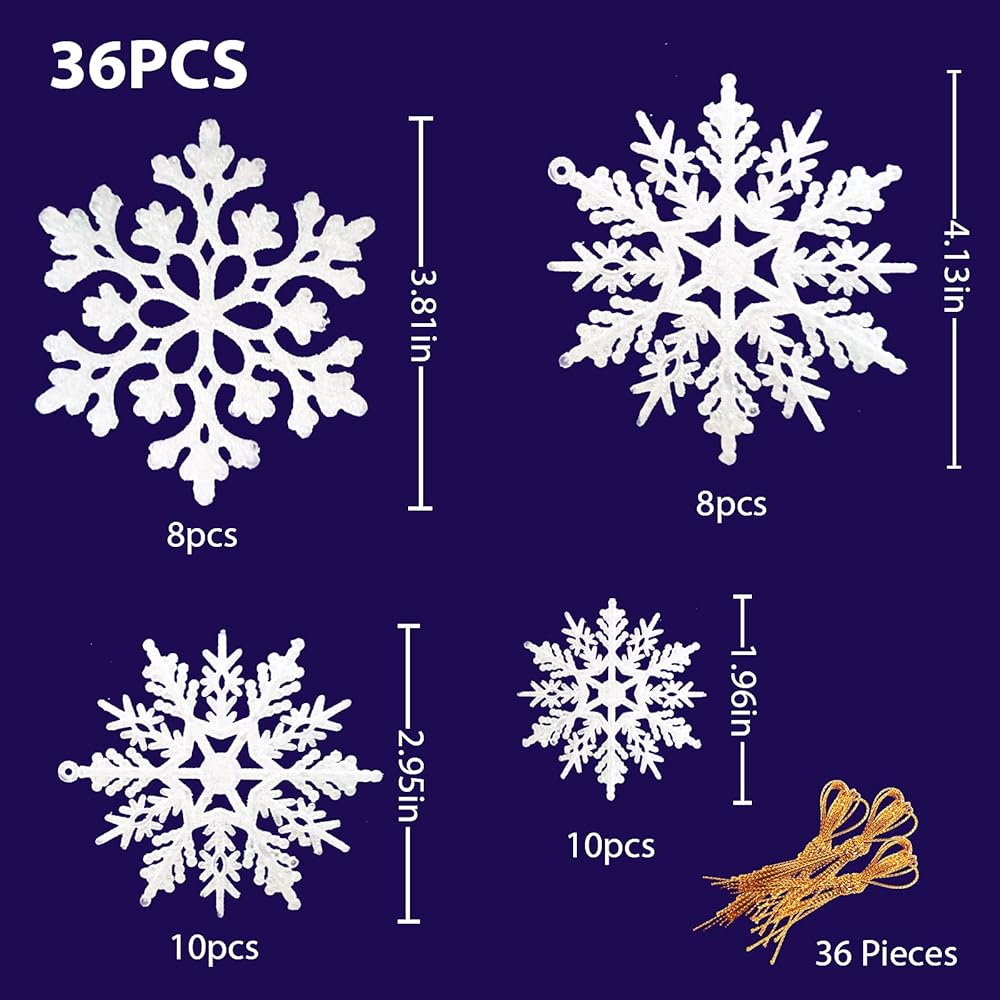 36 قطعة من الحلي البلاستيكية ندفة الثلج، أحجام متنوعة لامعة بيضاء بريق ندفة الثلج عيد الميلاد زينة زينة معلقة لتزيين عيد الميلاد والحرف والزفاف والزخرفة