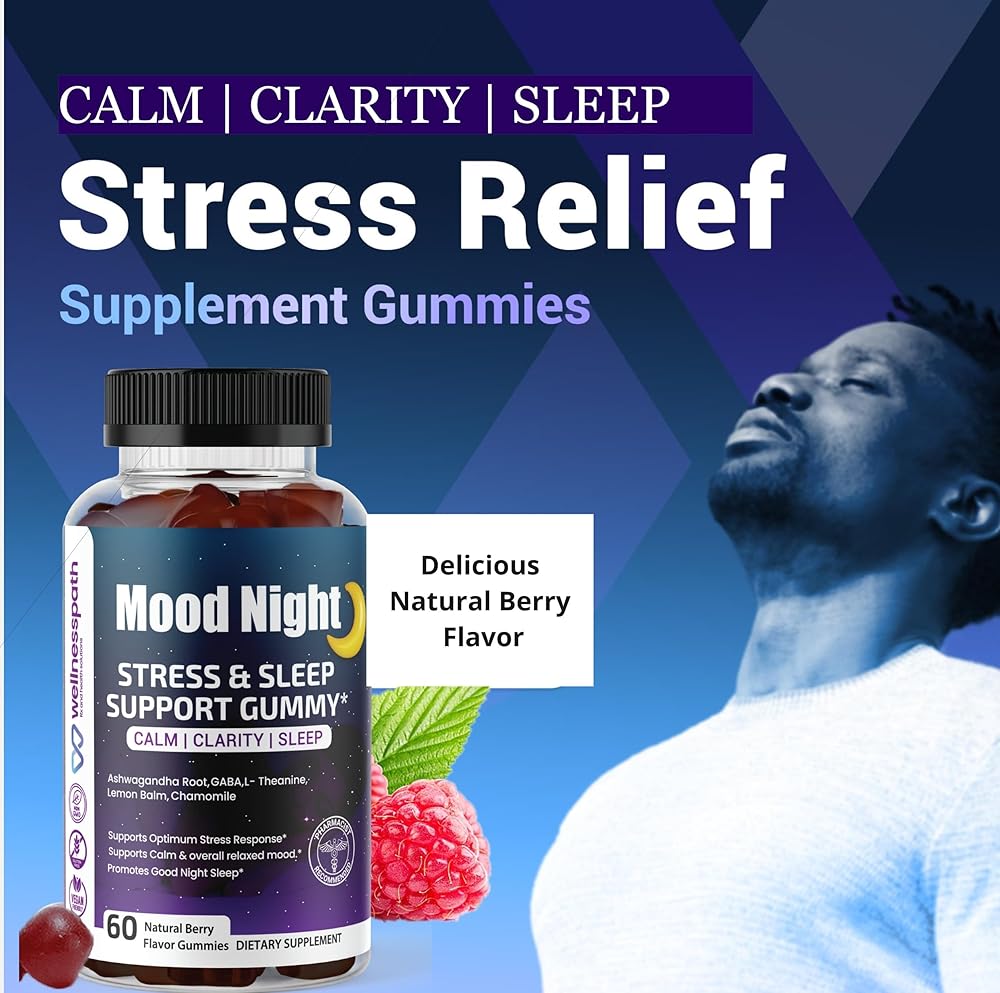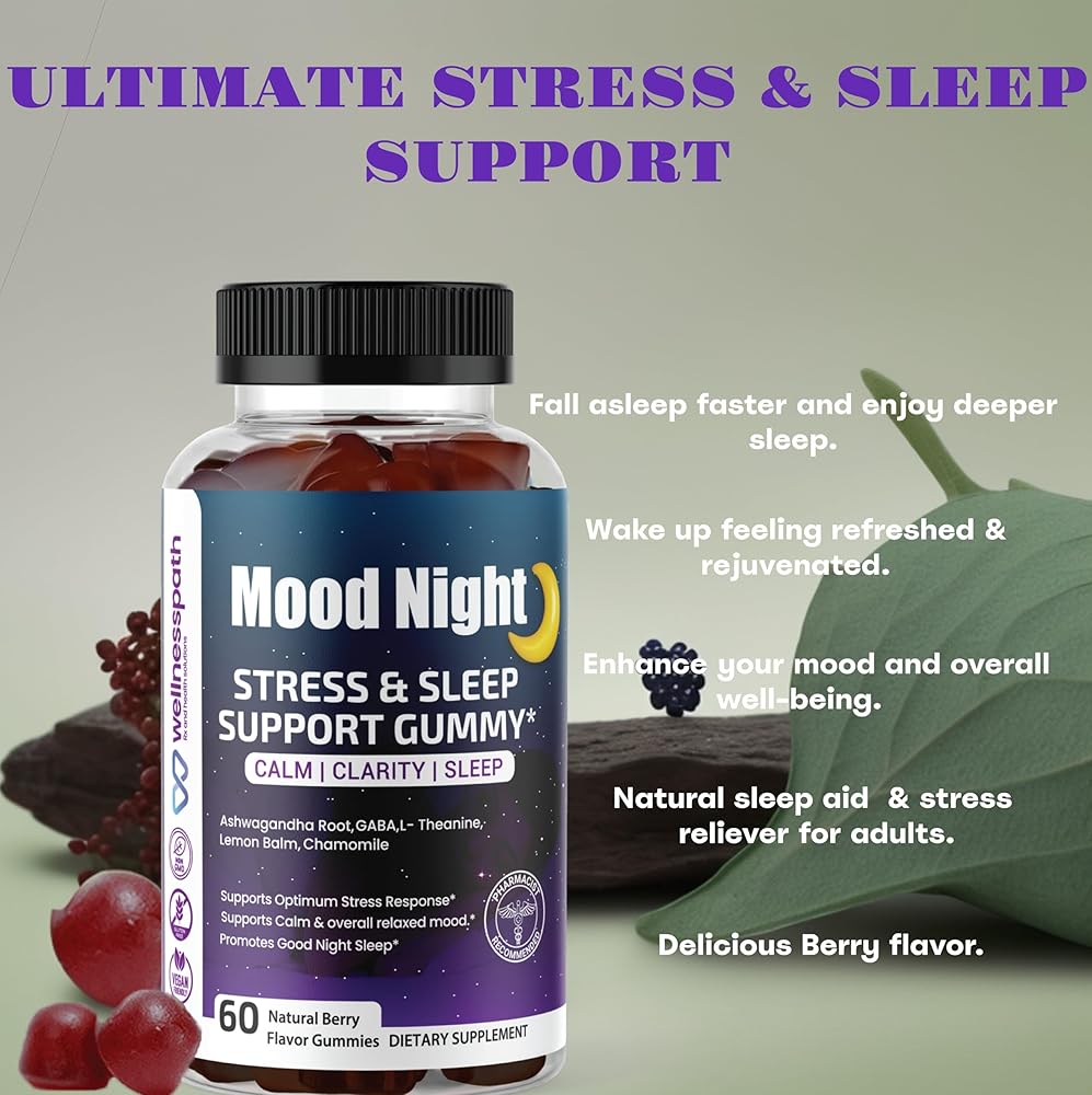 ليلة مزاجية| مكملات أشواغاندا للمساعدة على النوم وتخفيف التوتر، علكات مهدئة للنوم العميق، مع أشواغاندا، بلسم الليمون، غابا، إل- الثيانين والبابونج، 60 قطعة - ويلنيس باث آر إكس وحلول صحية.