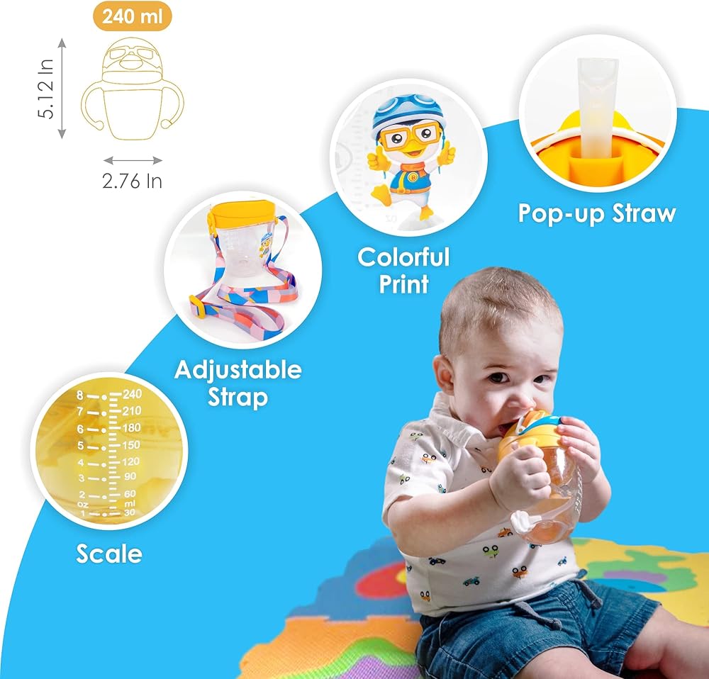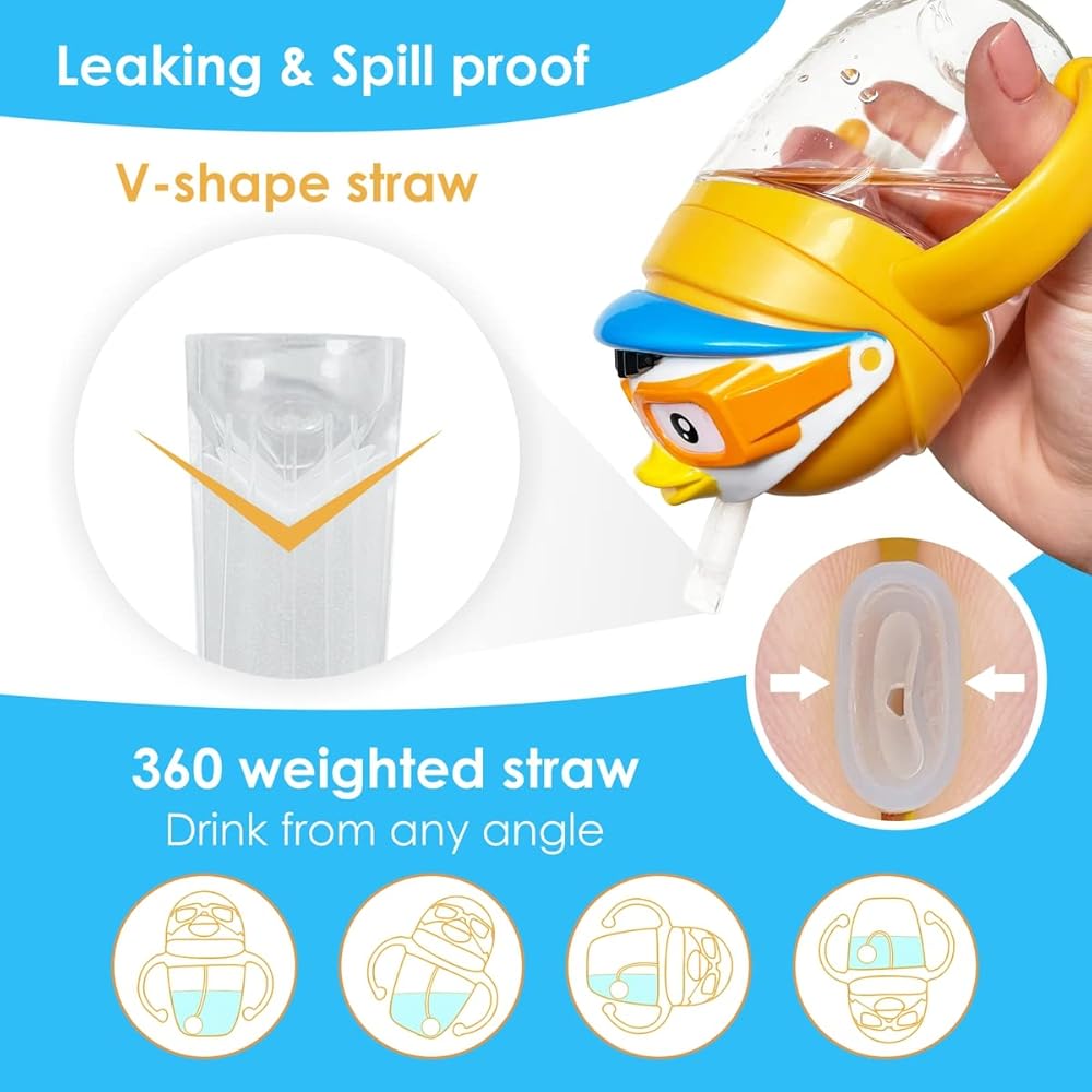 تصميم المميزات: كوب الماصة ذو الثقل مضاد للتسرب، مع ميزة شرب بزاوية 360 درجة. سوف تنتقل الكرة الصغيرة ذات الوزن داخل الكوب إلى المكان المناسب في كل مرة يتحرك طفلك للتأكد من أنه يمكنه الشرب من أي زاوية. لديك خيار جعلها ذات مقبض مزدوج لطفلك لتسهيل الإمساك بها، أو إزالة المقابض ووضع الحزام المتصل بعربة الأطفال. التصميم الملون المطبوع على مقدمة الزجاجة سيجذب طفلك إليها أكثر.