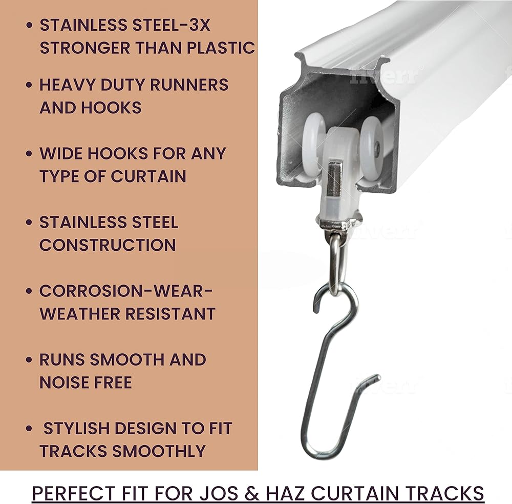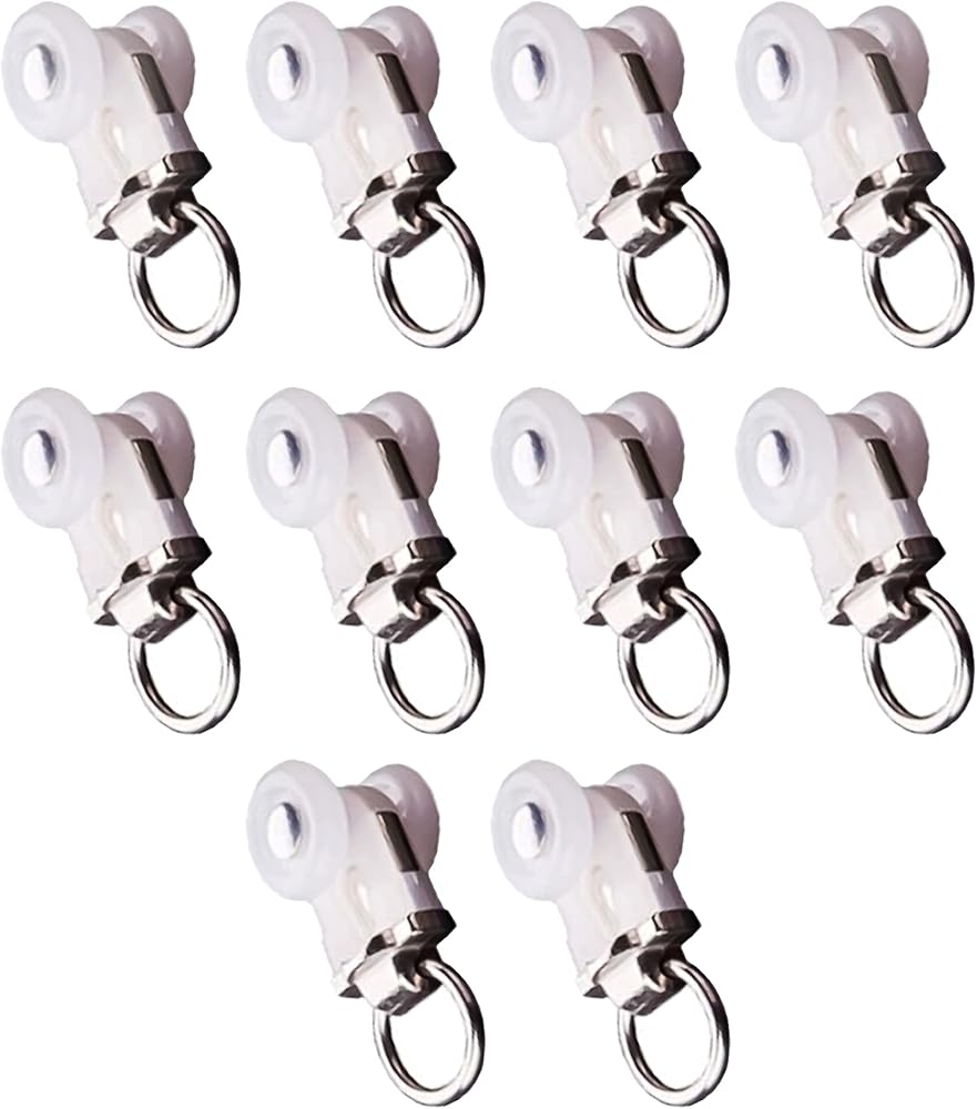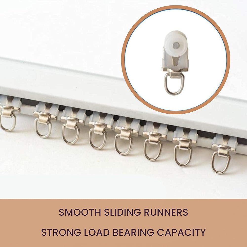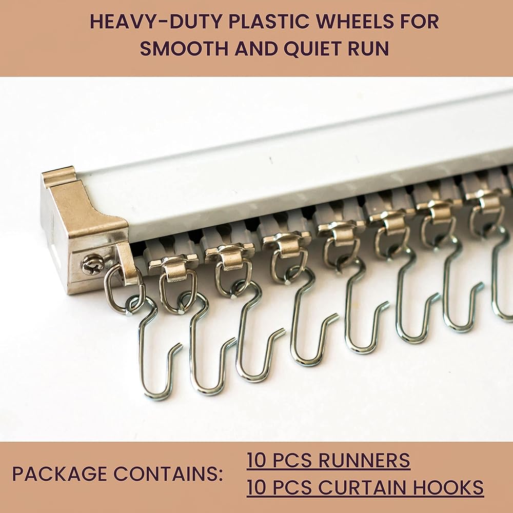 Heavy Duty Runners and Hooks for Curtain Tracks -Wheeled Curtain Carriers designed for Aluminum Curtain Tracks -Smooth Gliding Runners with plastic wheel rollers for easy slip thru between curtain tracks -Unique Curtain Hooks to use with any type of Curtain. Roller DimensionsWheel Diameter: 0.5 INCHESRoller Width:0.50 INCHES Roller length: 1.30 INCHES Roller length including hooks: 2.5 INCHES