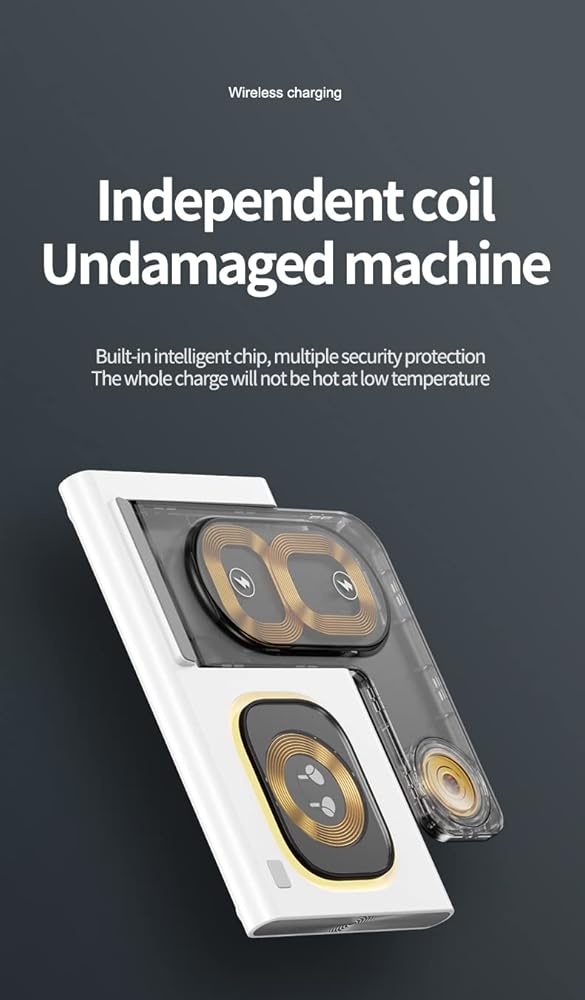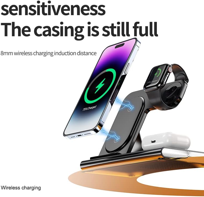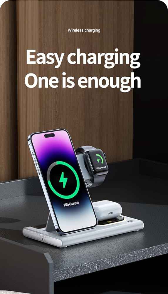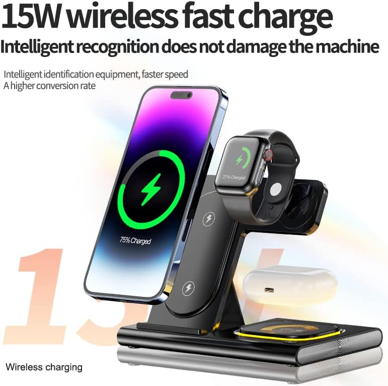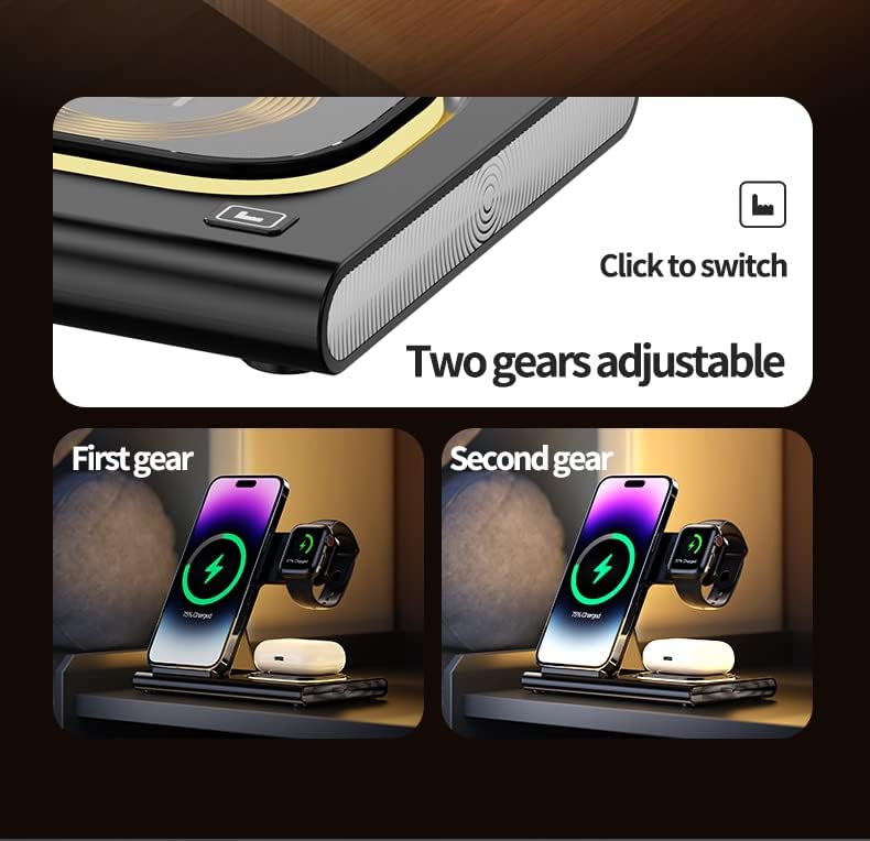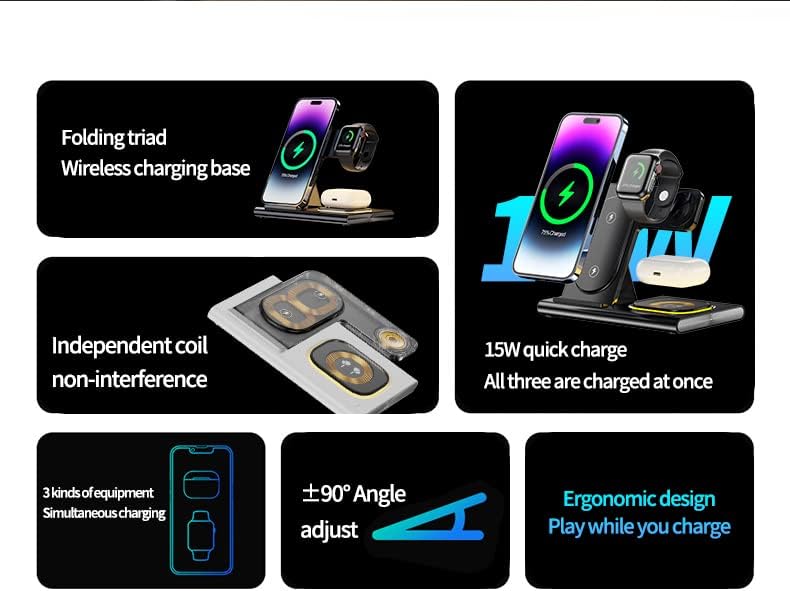 Magnetic Foldable Charging Station compatible with: iPhone, Apple Watch, Airpods & has a LED Night Light. Simultaneously charge all 3 devices and use it as a night light. Three selecable positions for your phone or fold it flat. It folds flat to save space and makes it easy to carry with you on the road. Once you use it, you may ask how you ever got along without it. Goodbye clutter & simplyfy your desktop. 8mm charging distance. USB Type-C charge cable. Included: USB Type-A TO Type-C charge cable. Power input: 9v @ 2A. Your phone/device must support wireless charging. Phone/Watch/Earphone are shown for demonstration only and are not included.
