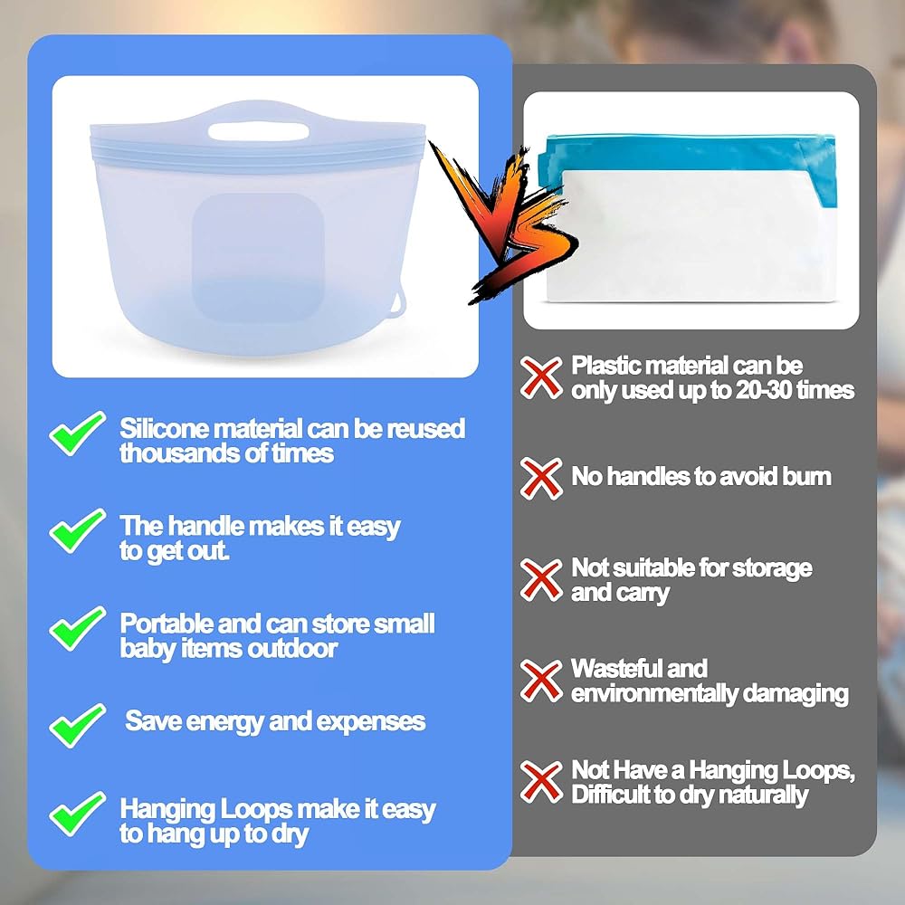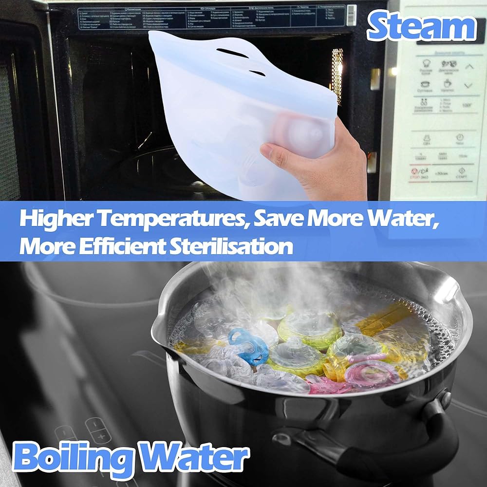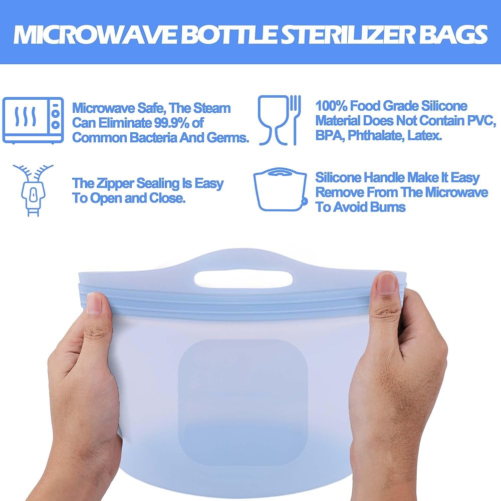 Excellent material: The silicone material does not contain pvc, bpa, phthalate, latex. It is a food-grade material that is both durable and environmentally friendly, and can direct contact with baby products. The microwave steam bags has high temperatures resistant and does not break down into harmful substances like plastic. Compared to disposable steam bags that can only be used 20 times, our the microwave bottle steam can be reused thousands of times, saving energy and expenses