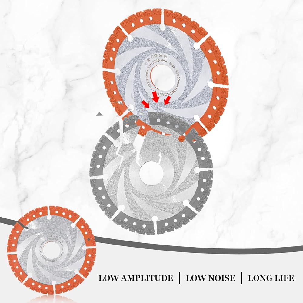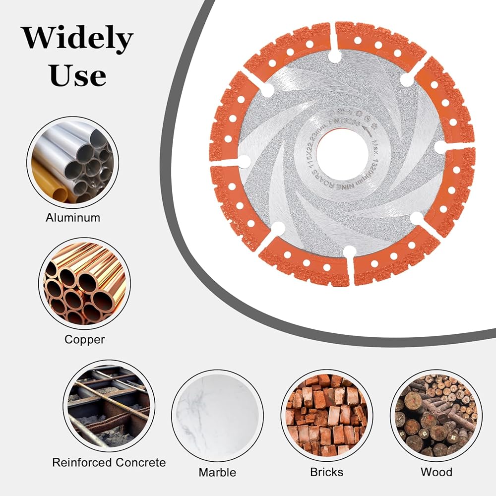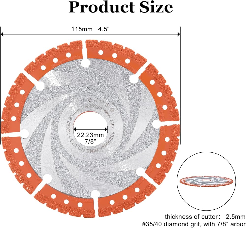 القطر الخارجي 115 مم (4.5 بوصة)، سُمك القاطع 2.5 مم، القطر الداخلي 22.23 مم (7/8 بوصة)، #35/40 حبيبات ماسية، مع عمود 7/8 بوصة، مناسب لمعظم المطحنة اليدوية أو منشار القطع.
