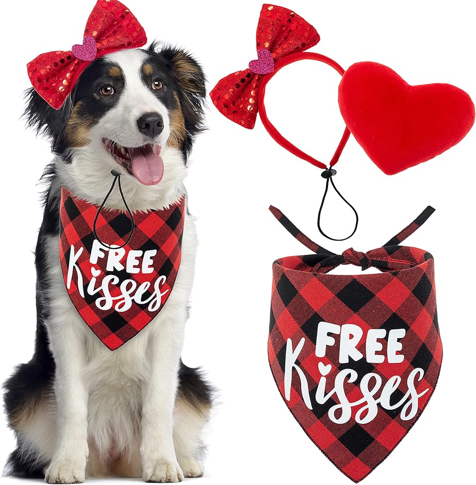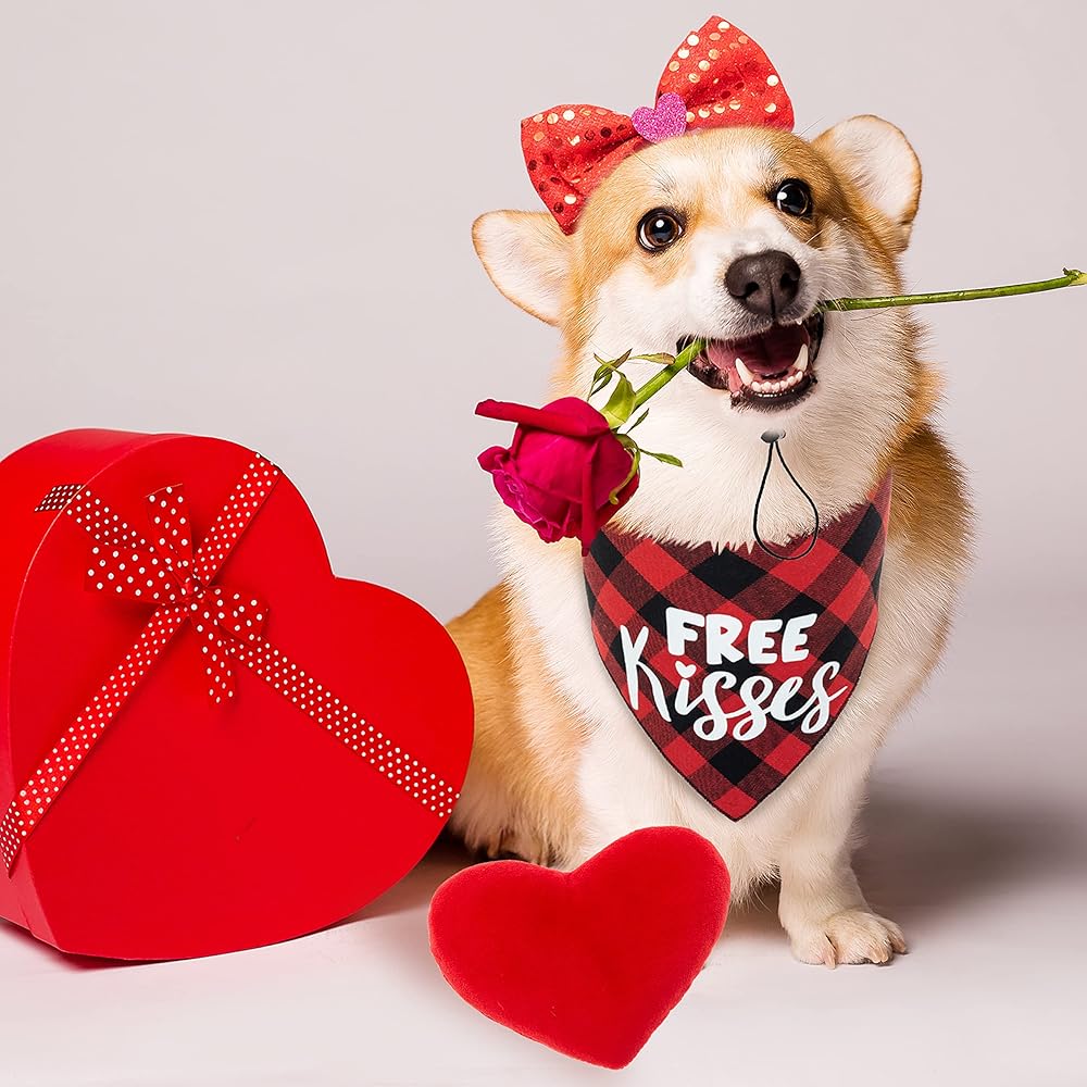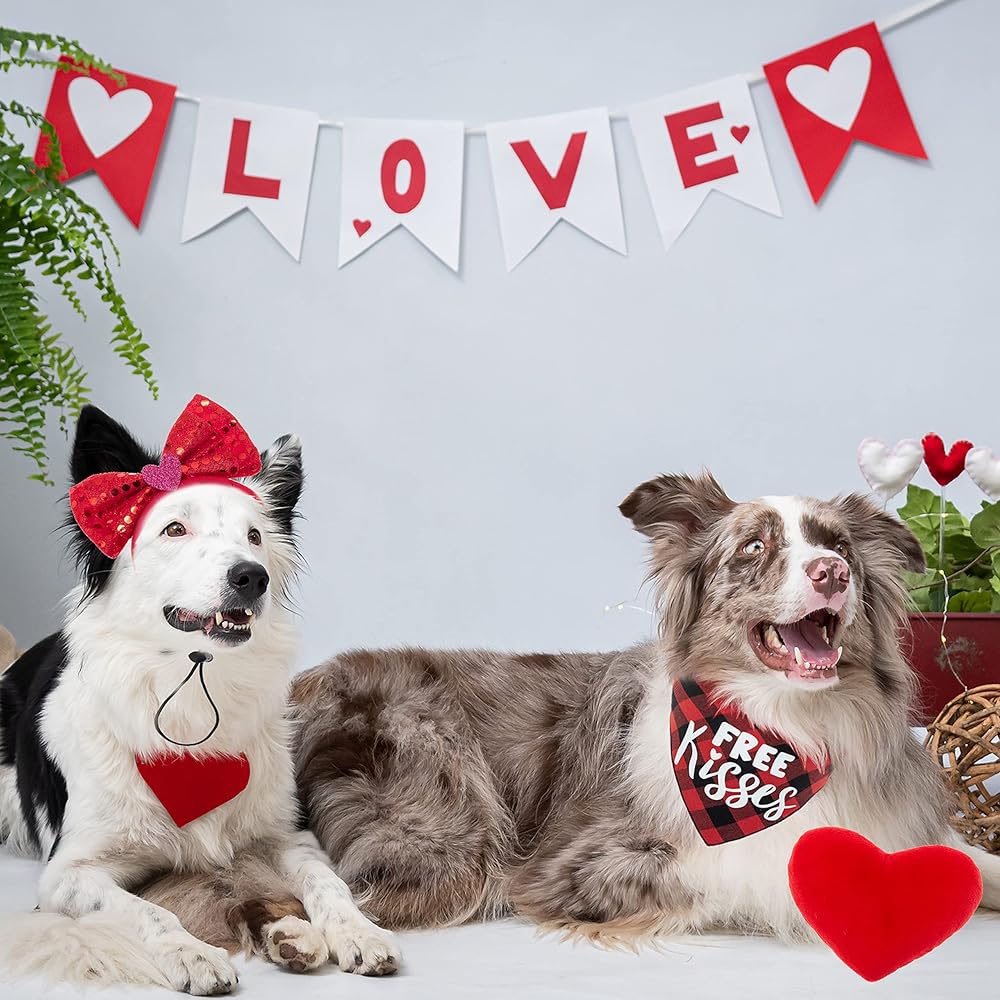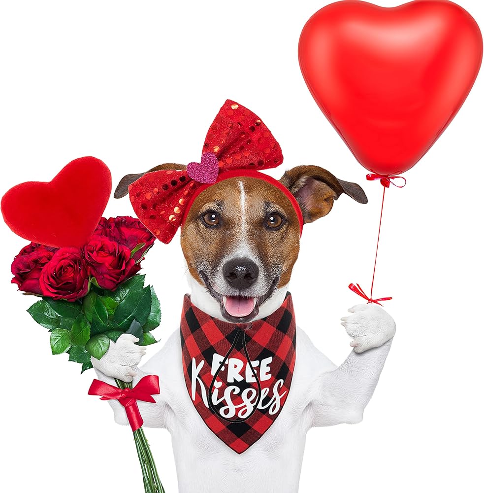 مجموعة زي تنكري للكلاب لعيد الحب من زيمياس - باندانا حمراء منقوشة وربطة عنق على شكل فيونكة وشريط رأس بلينج للكلاب ولعبة قطيفة على شكل قلب للعطلات والحفلات وعيد الحب