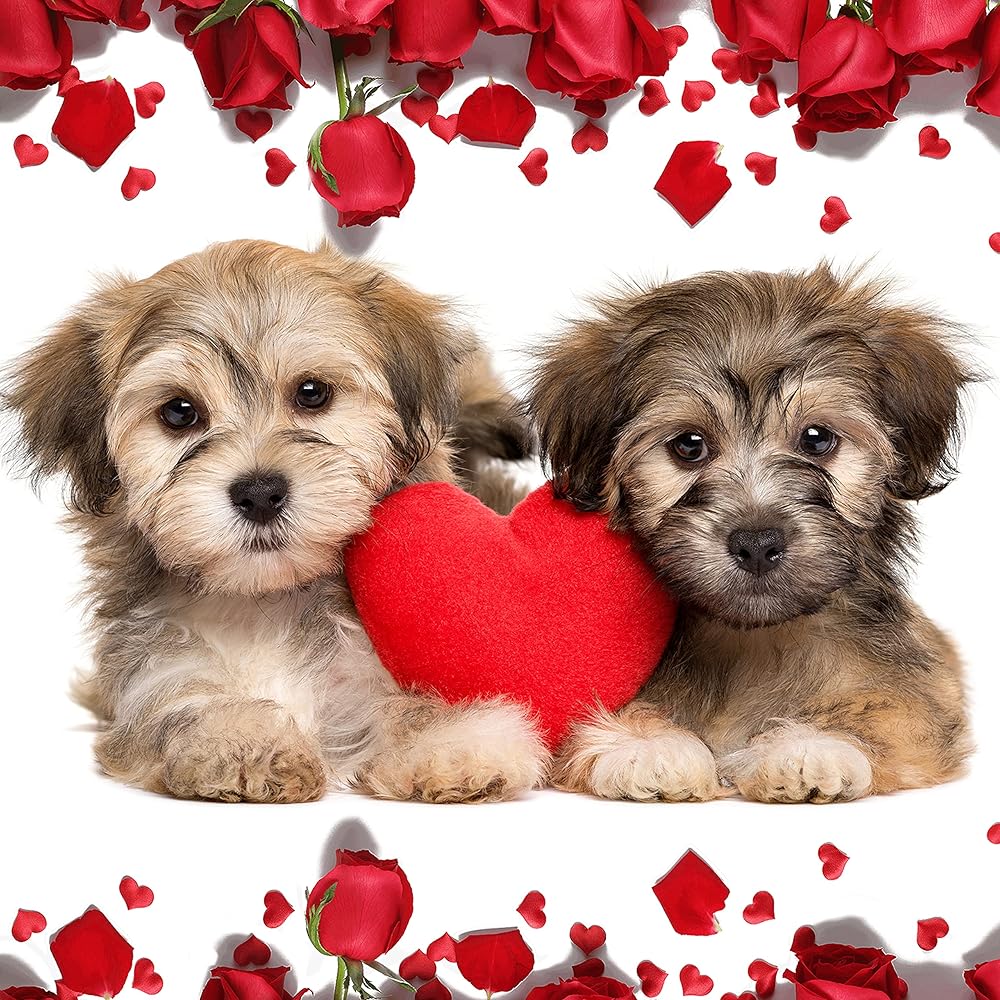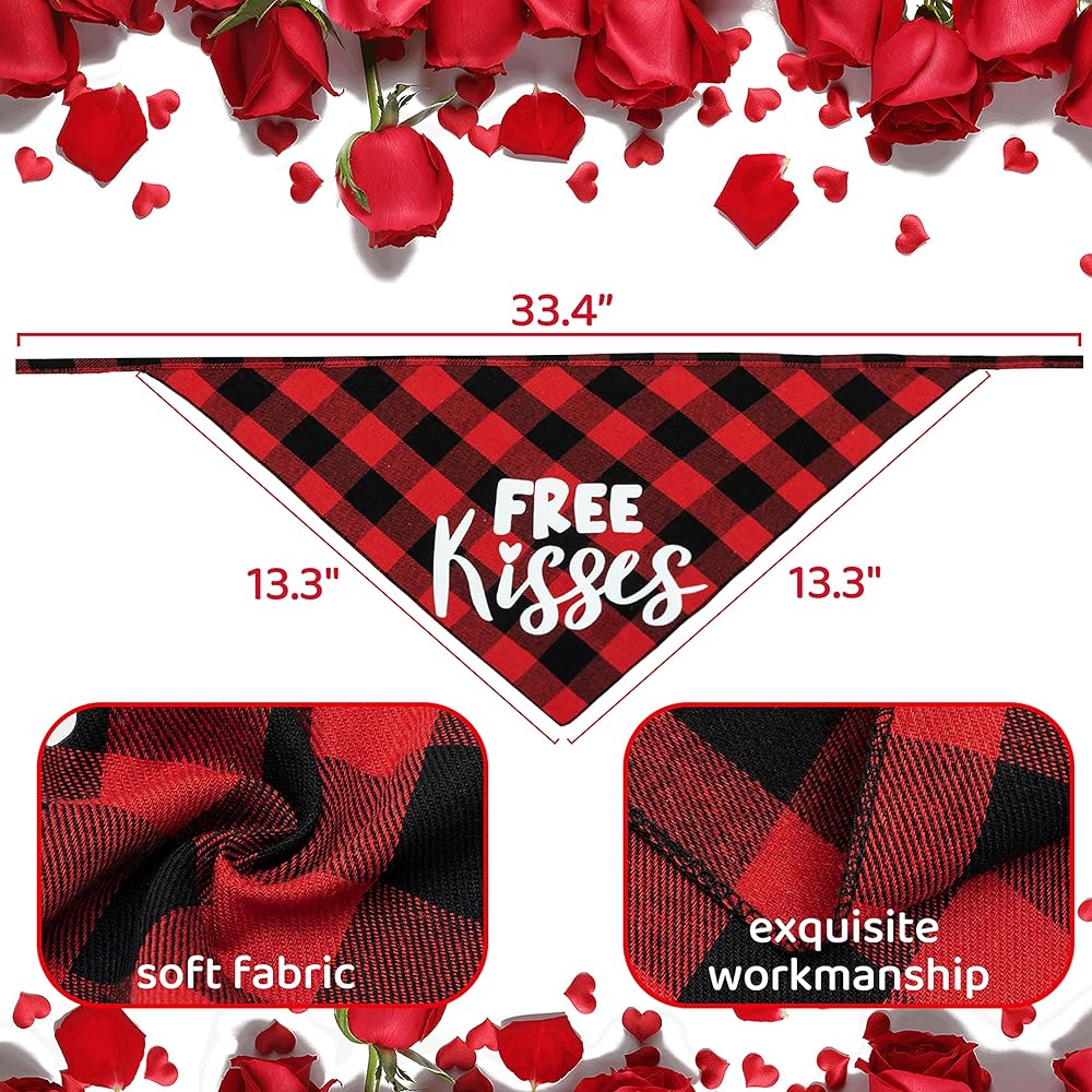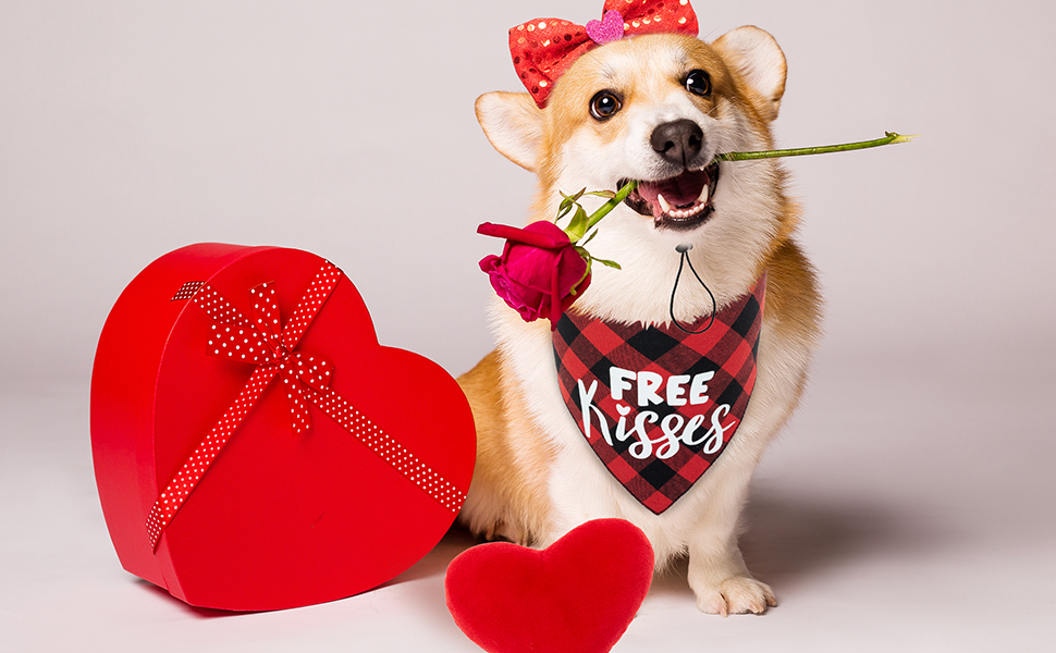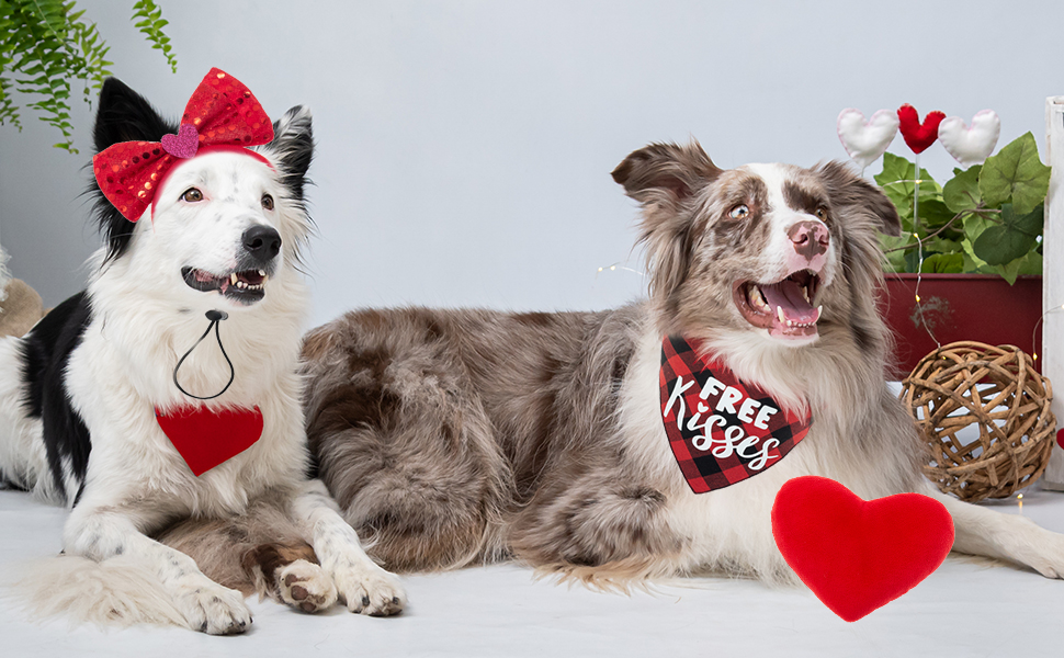 مجموعة زي تنكري للكلاب لعيد الحب من زيمياس - باندانا حمراء منقوشة وربطة عنق على شكل فيونكة وشريط رأس بلينج للكلاب ولعبة قطيفة على شكل قلب للعطلات والحفلات وعيد الحب