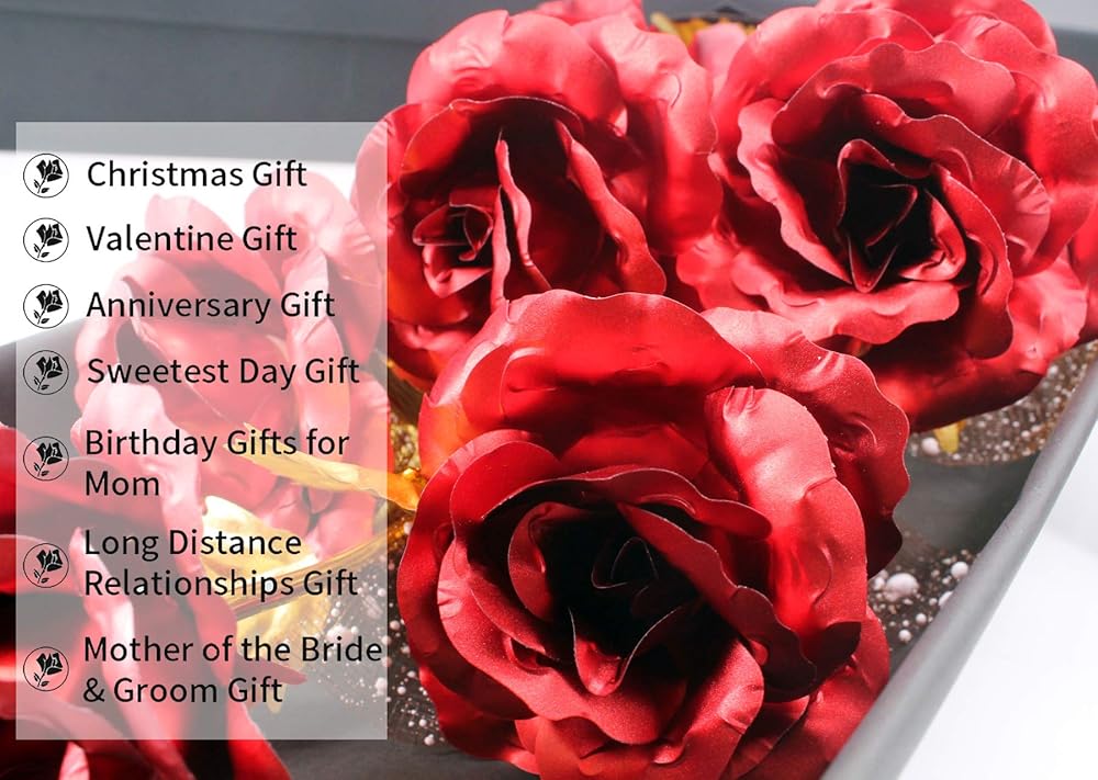 • تُعد الوردة المغطاة بالذهب عيار 24 قيراط هدية رائعة للأم والزوجة والصديقة. يمكن استخدامه أيضًا في عروض الزواج، والذكرى السنوية للزفاف، وأعياد الميلاد، والخطوبة، وعيد الحب، وعيد الأم، والكريسماس، وما إلى ذلك.