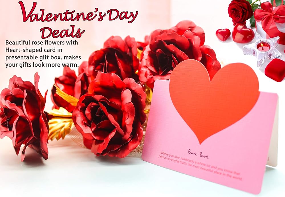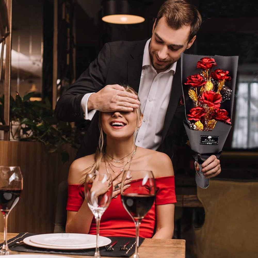 • تحتوي الباقة الرومانسية على 6 ورود من رقائق الذهب الحقيقية للغاية وتأتي في صندوق جميل وقوي مع شريط. حتى تتمكن من إعطائها للآخرين مباشرة.