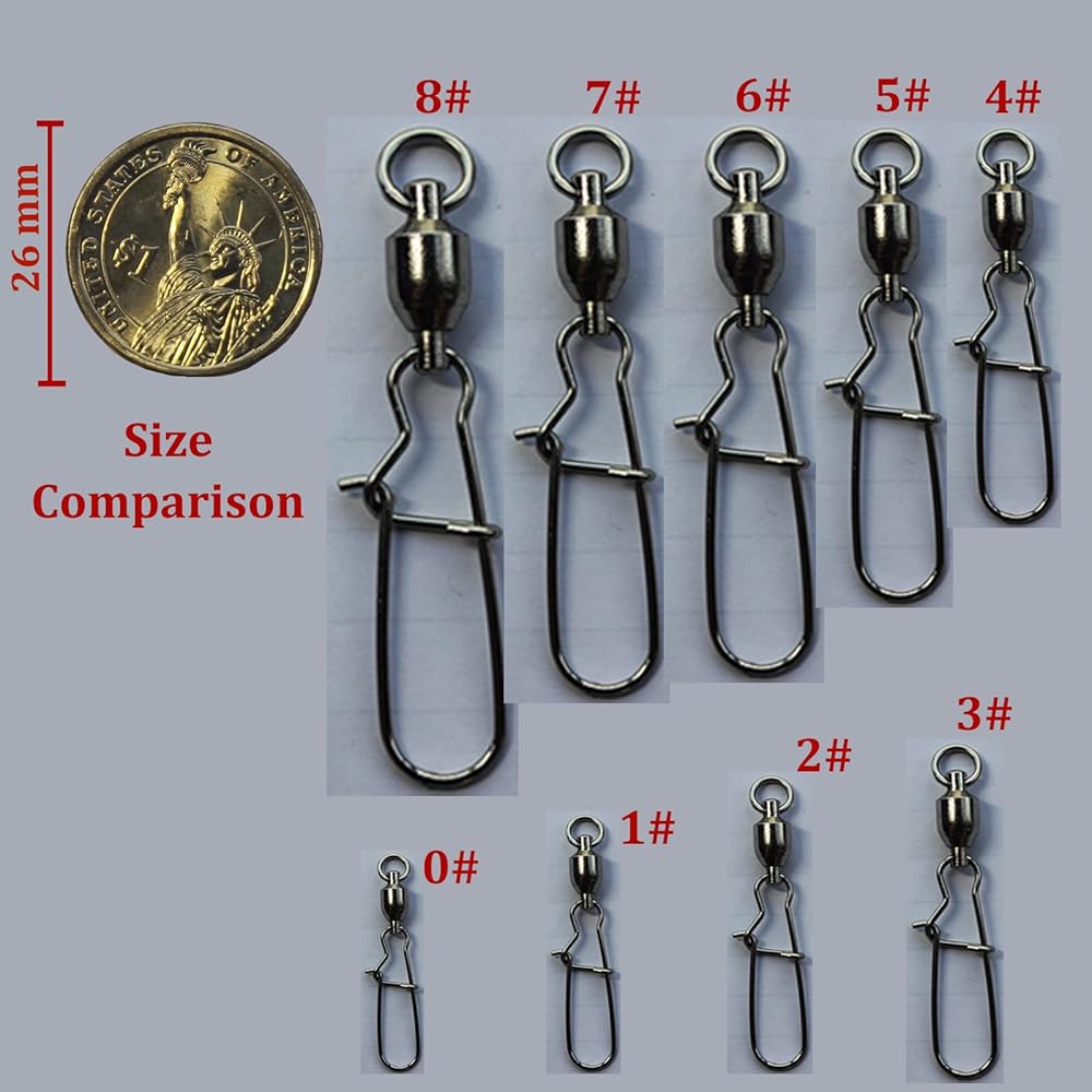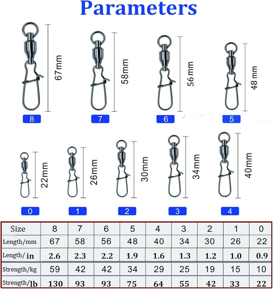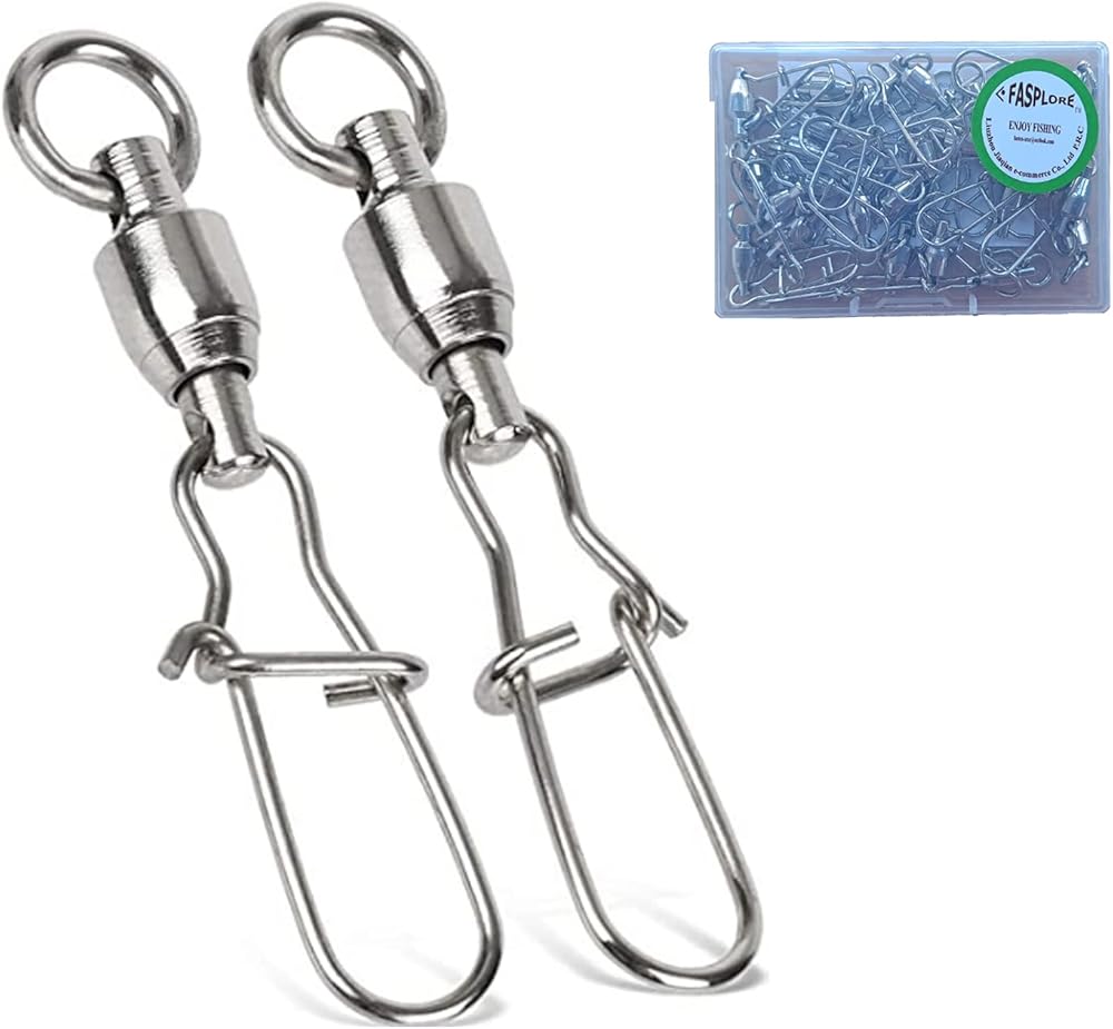 1.Product: Fishing Ball Bearing Swivel with Duo-Lock Snap 2.Package: 10-25 pcs/pack according to kit, plastic box packaging 3.Material: stainless steel, copper, nickel coated 4.Full Sizes:11 sizes available 5.LB Test :From 22 lbs to 174 lbs according to sizes 6.FASPLORE Service: Any question please contact us directly, we will take full responsibility for any quality problems ,we adhere to amazon return policy!