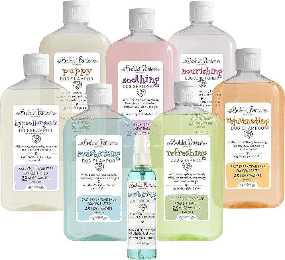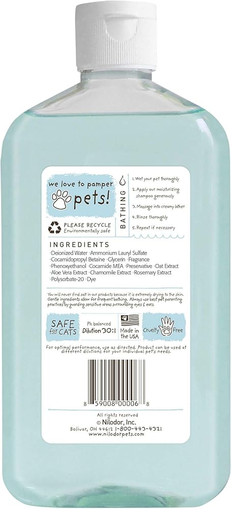 Groomers love this line! Salt Free - Tear Free - Cruelty Free - Safe For Cats. Rinses and dries fast. Highly concentracted! Moisturizing dog shampoo with oatmeal, chamomile, rosemary and aloe vera gel. Moisturizes and enriches skin and fur.