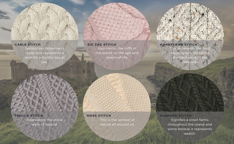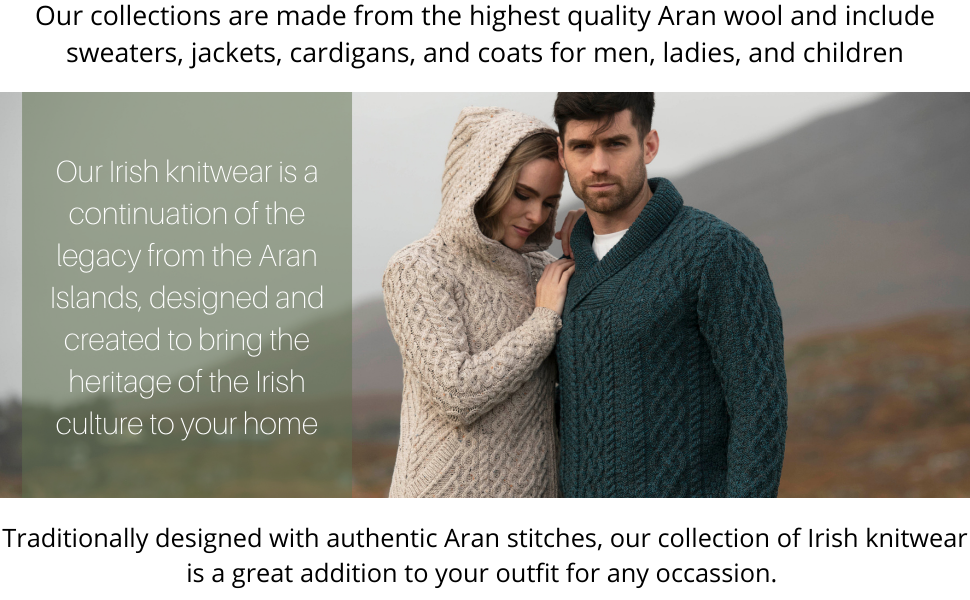 - احتضان الثقافة: يضمن استخدام الغرز الأيرلندية التقليدية في جميع أنحاء ملابسنا الحفاظ على تاريخنا الطويل من الحرف الأيرلندية على قيد الحياة.