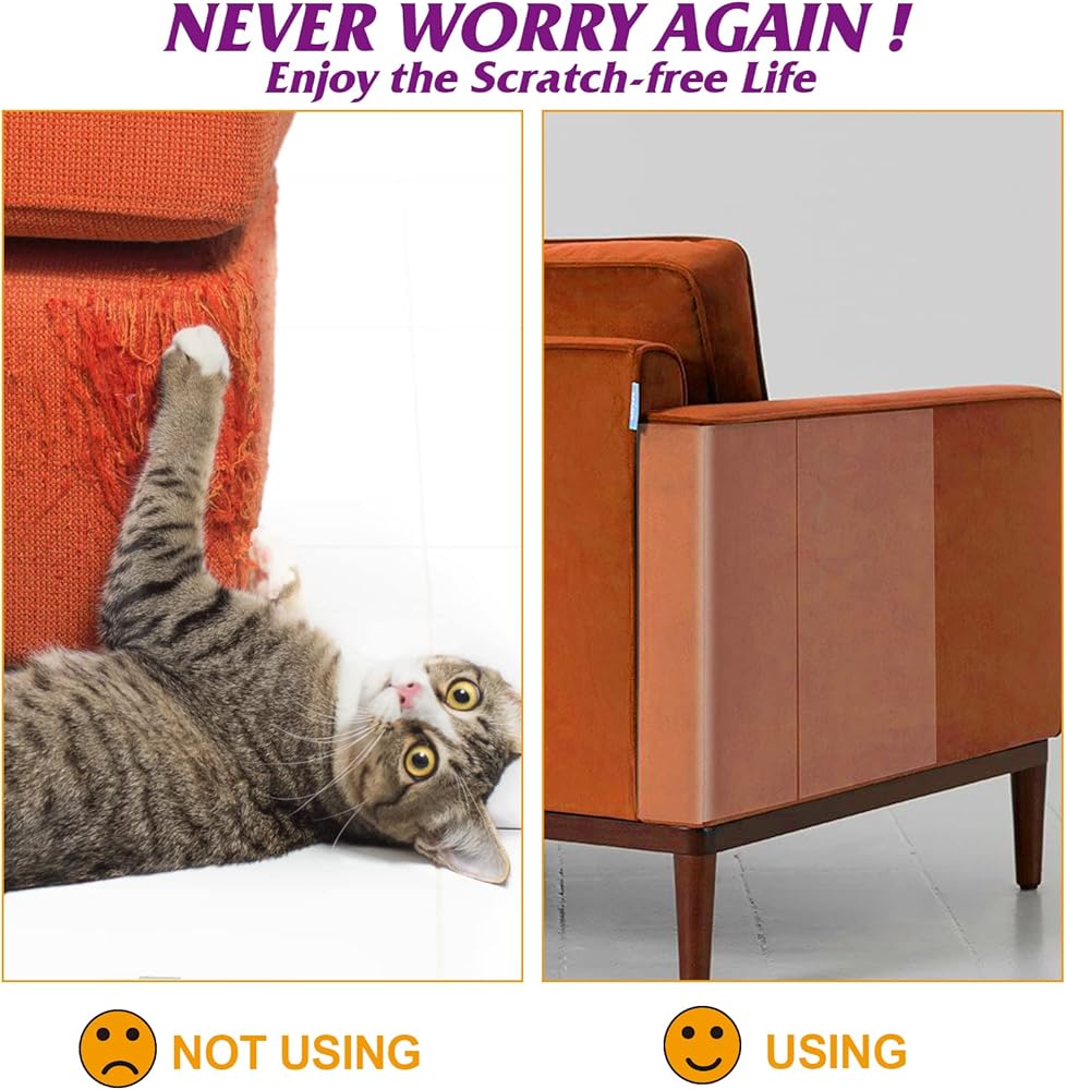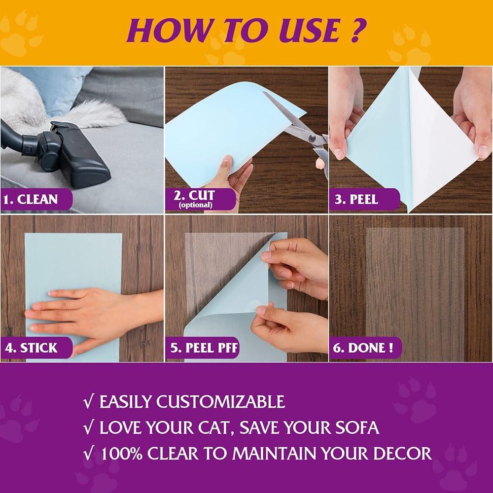 • سهل التركيب وشفاف - يمكن لواقي الأثاث من القطط أن يغطي جانب الكرسي أو الأريكة بشكل لطيف، وينحني حول المسند ويوضع بشكل مسطح على السجاد ويمكن قصه إلى الشكل المطلوب. مع دليل التركيب الخاص بنا، يجب ألا يستغرق الشريط المضاد للخدش أكثر من 5 دقائق للتطبيق. ينتهي بك الأمر بغطاء إنتاجي شفاف تمامًا بالكاد لا يفسد مظهر الأريكة. لا حاجة إلى دبابيس ولن تؤذي أريكتك أو تأكلها القطط.
