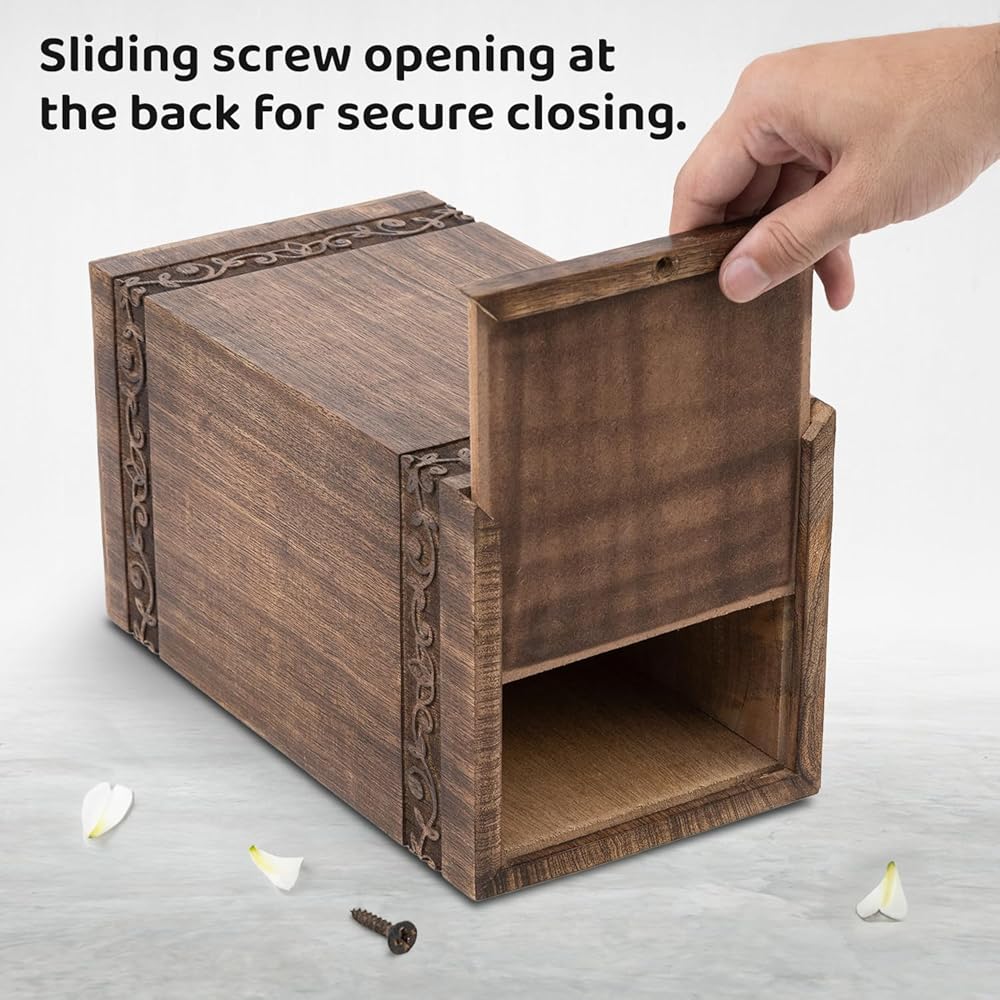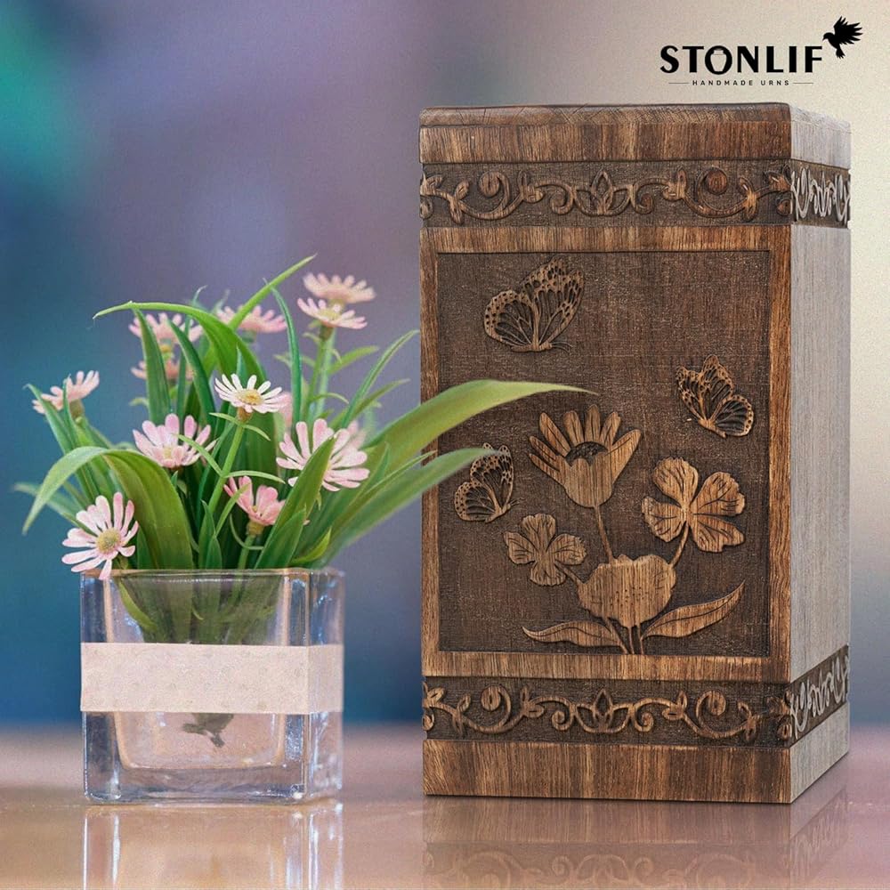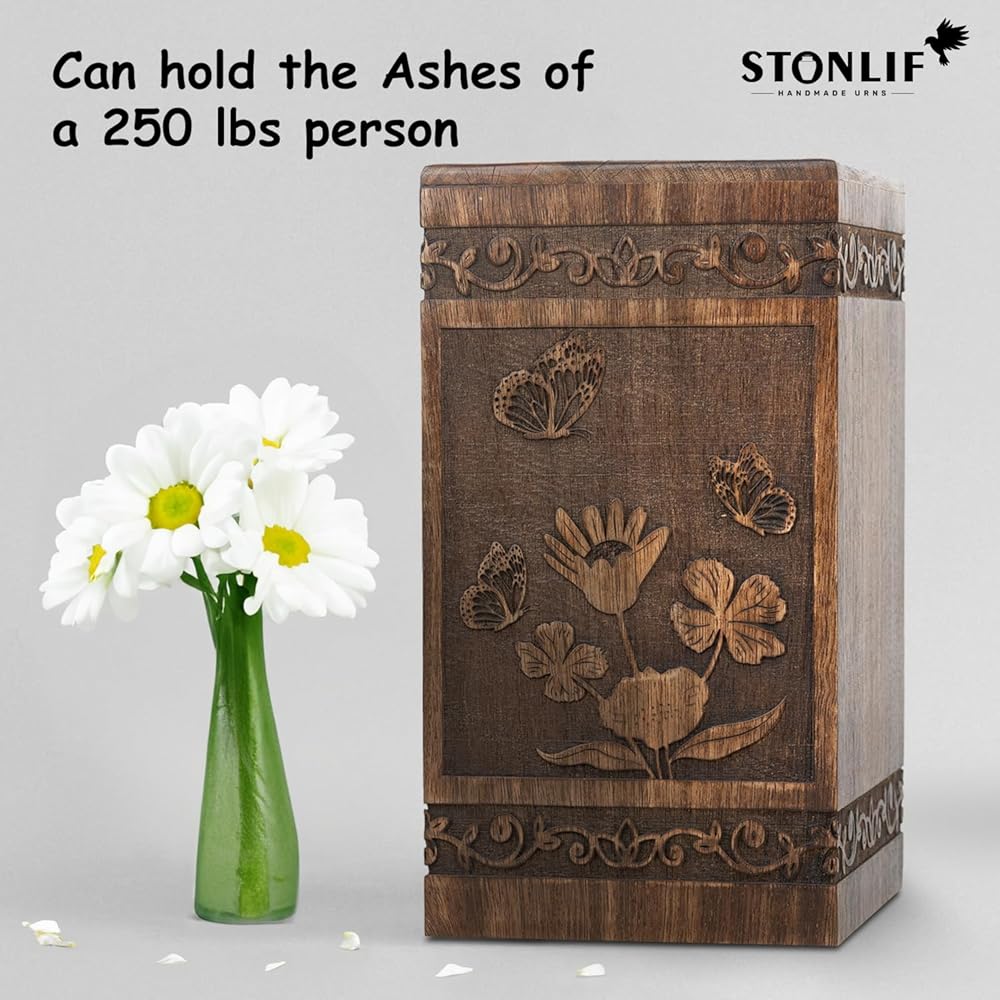 • Sustainable Handcrafted Urn: Our urn for human ashes is made from high quality mangowood with a butterfly design, has a sliding screw opening at the bottom.