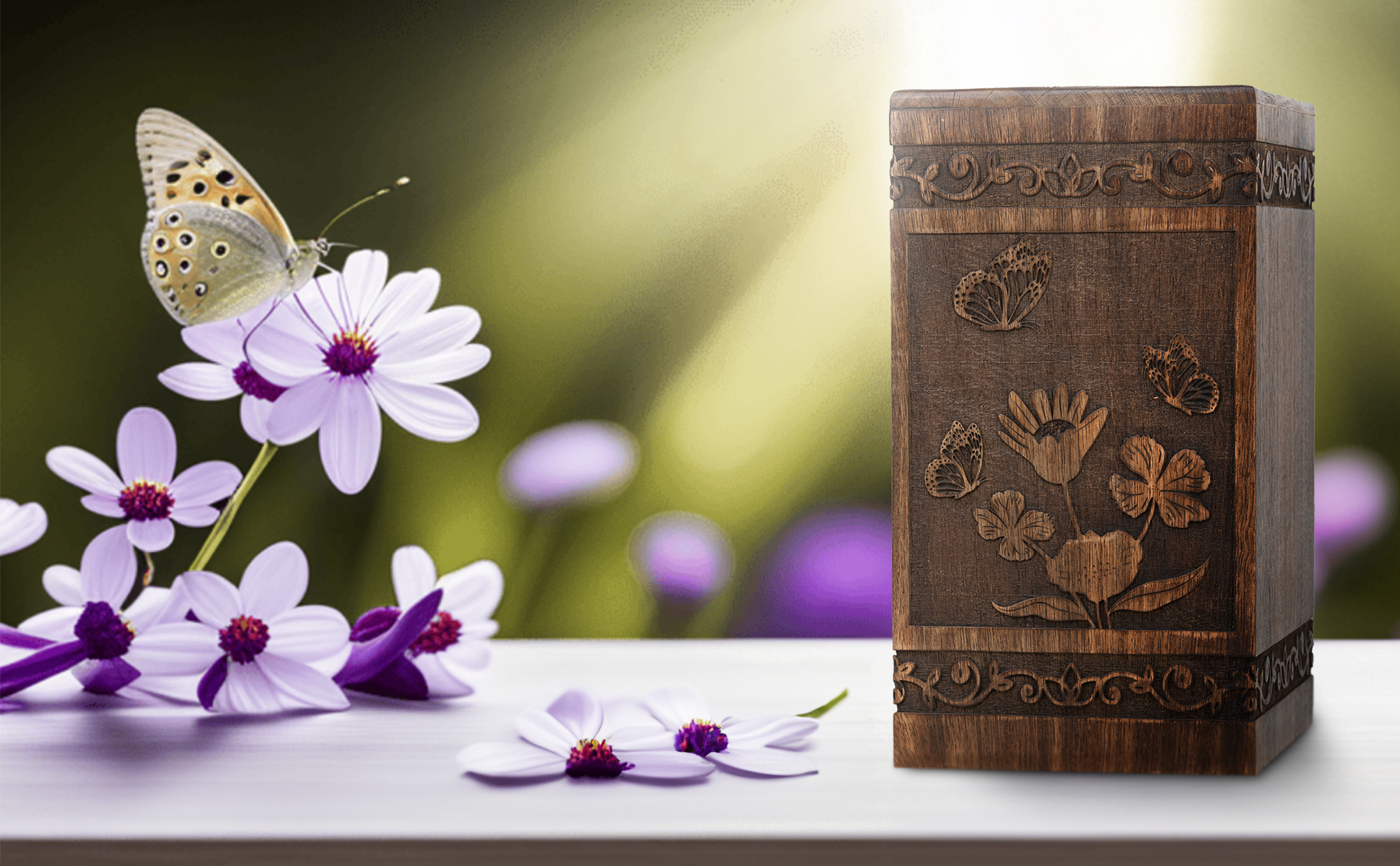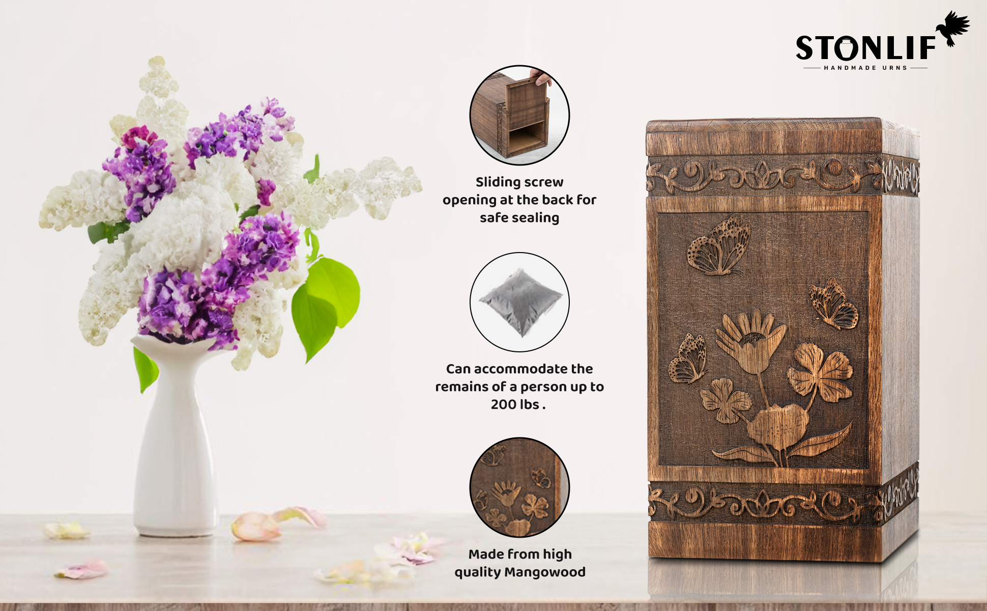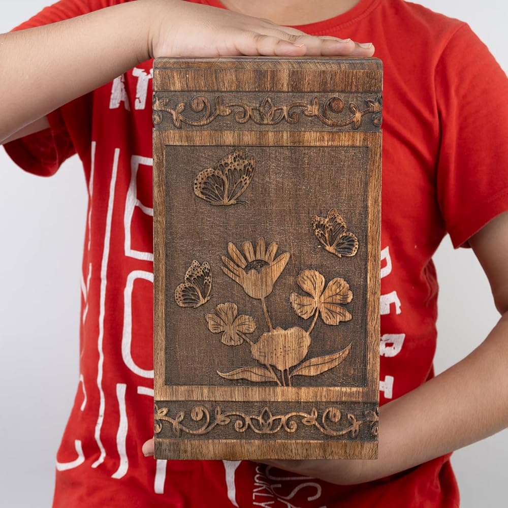 • Sustainable Handcrafted Urn: Our urn for human ashes is made from high quality mangowood with a butterfly design, has a sliding screw opening at the bottom.