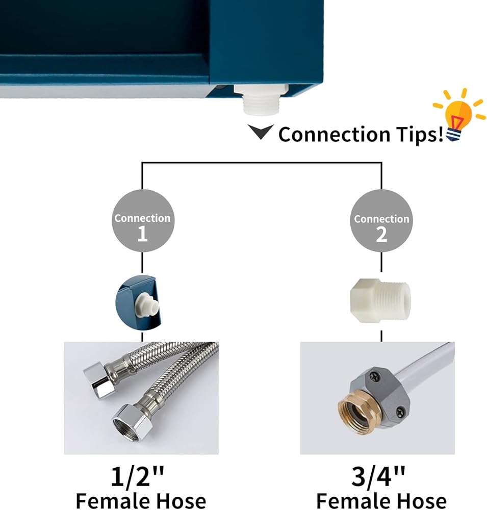 خيار الاتصال: 1. قم بتوصيله بخرطوم طرفي أنثى 1/2 بوصة غير متضمن في العبوة؛ 2. قم بتوصيله بخرطوم طرفي أنثى 3/4 بوصة مع محول. لا تنس لف شريط التيفلون قبل توصيله بخرطوم الماء أو المحول.