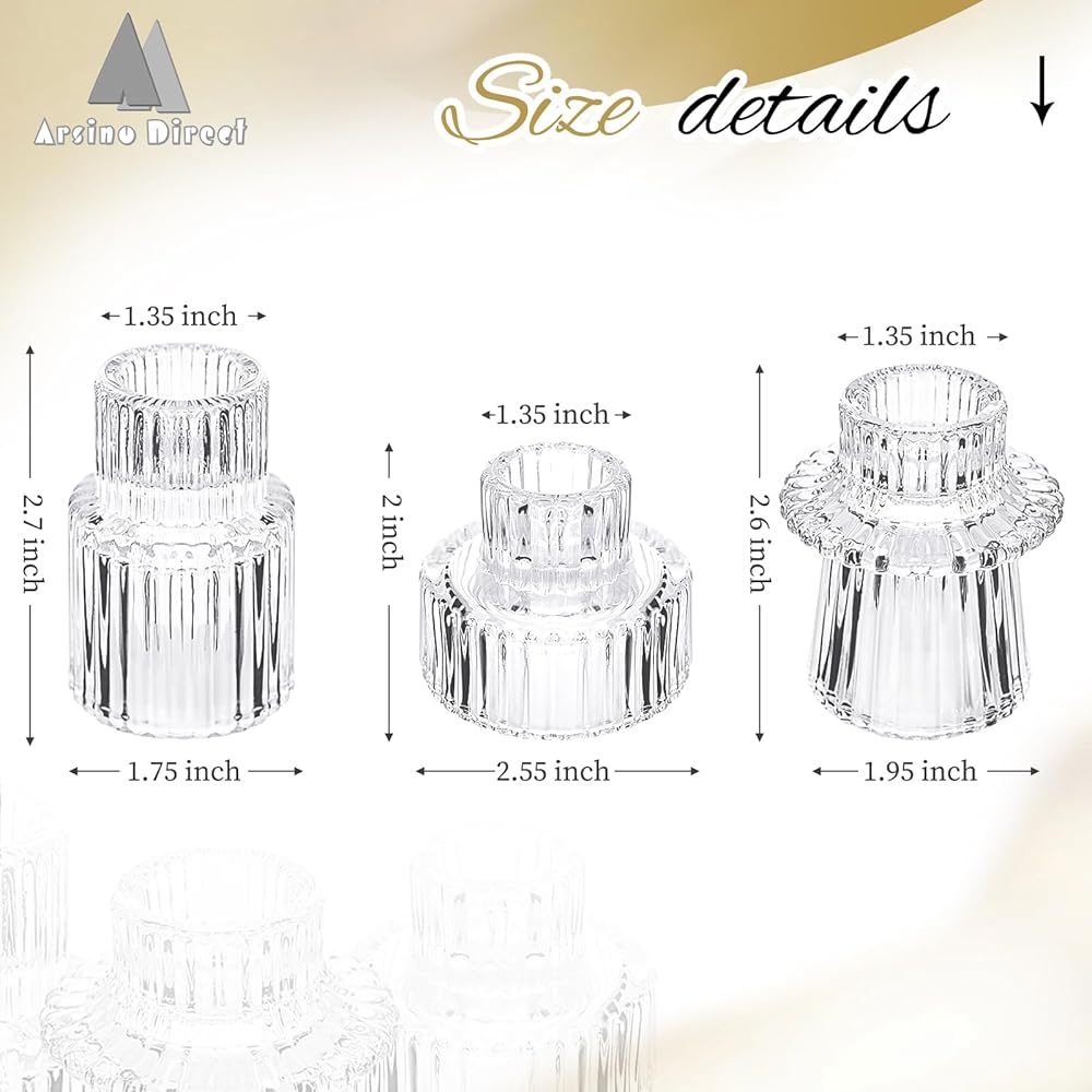 【Suitable Size】The top diameter of the glass candle holder is 1.35 inches/3.5cm, the base diameter and the height depending on the style.The diameter of the candle hole is 0.9 inches/2.3cm, and the height of the candle hole is 0.7 inches/1.8cm, which is suitable for most candles,Suitable for regular taper candles or other candles with a diameter less than 0.9 inches.