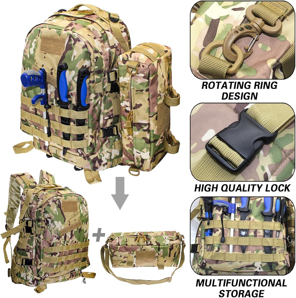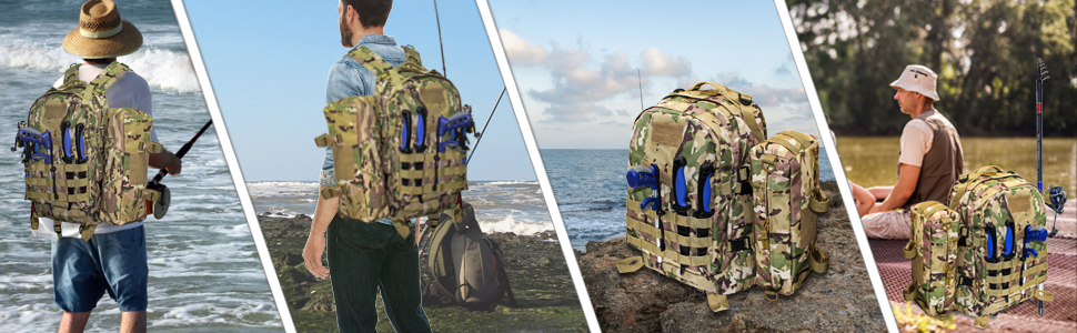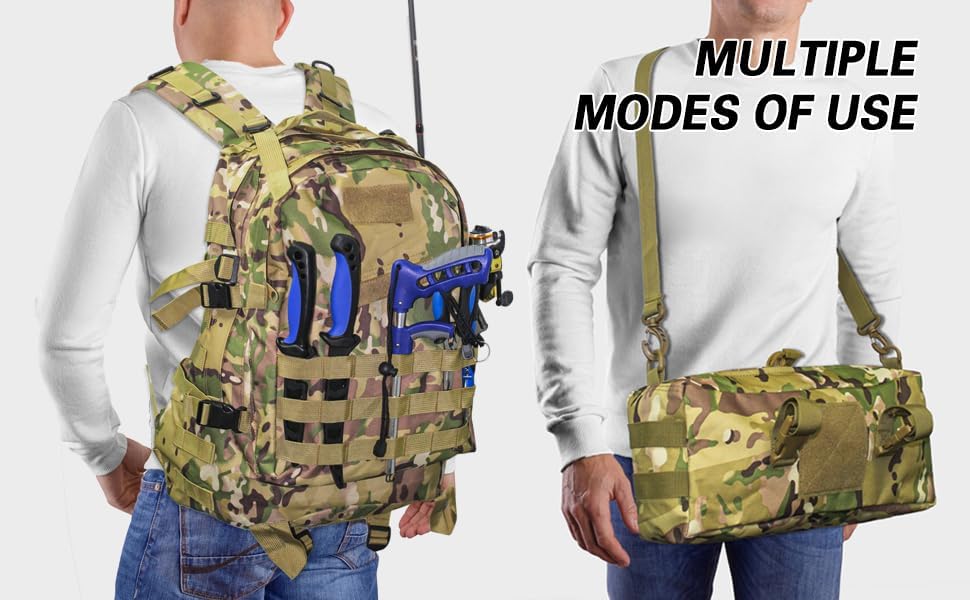 حقيبة جانبية قابلة للفصل: يمكن تعليق حقيبة حبال الصيد القابلة للإزالة مباشرة على الكتف وأخذها بيد واحدة. من خلال ضبط أحزمة الكتف، يمكن تعديل مجموعة حقيبة الظهر لصيد الأسماك من ديلاي إلى نمط حقيبة يد أو كروس أو كتف أو حقيبة صدر.