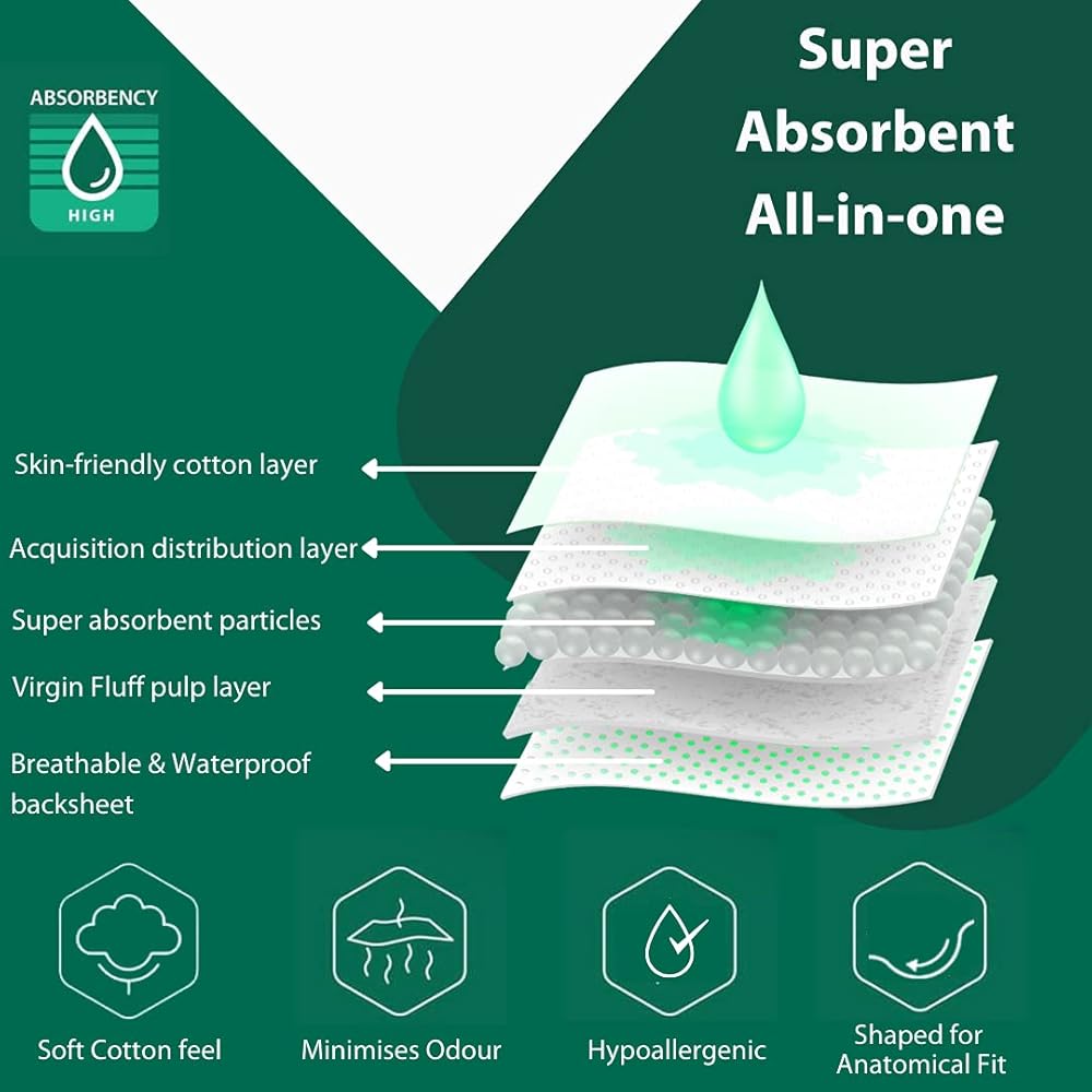 واقي من التسرب - توفر الحواجز الجانبية المطاطية المقاومة للماء الموجودة على فتحة الساق لوسائد سلس البول حماية إضافية ضد أي تسرب. يقلل مزيل الروائح الكريهة من الرائحة لزيادة الثقة والراحة.