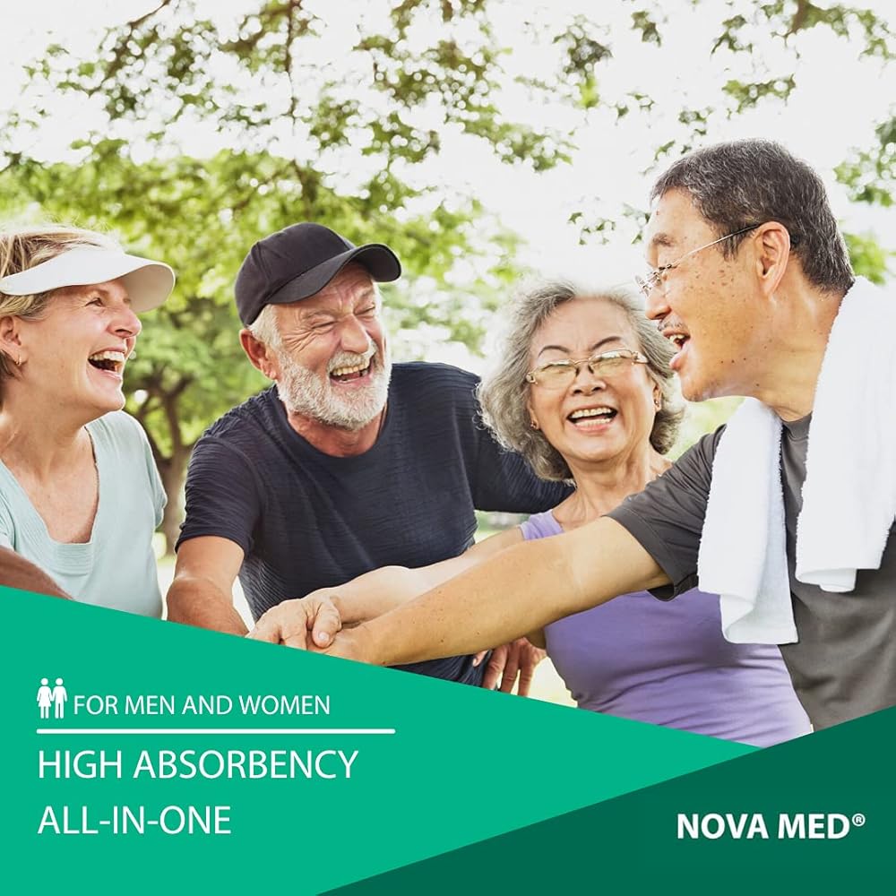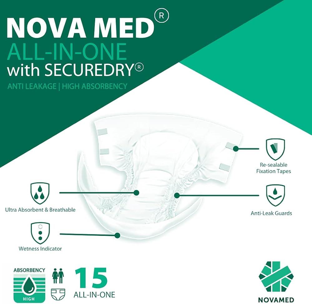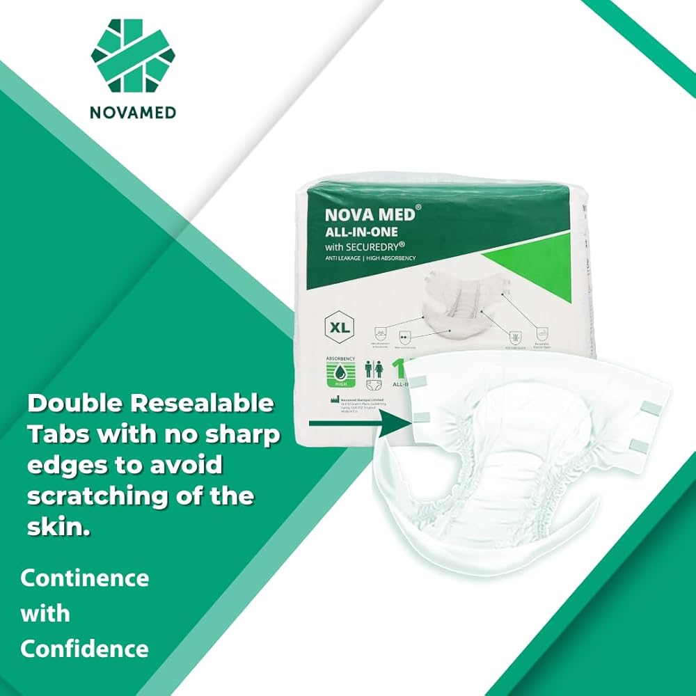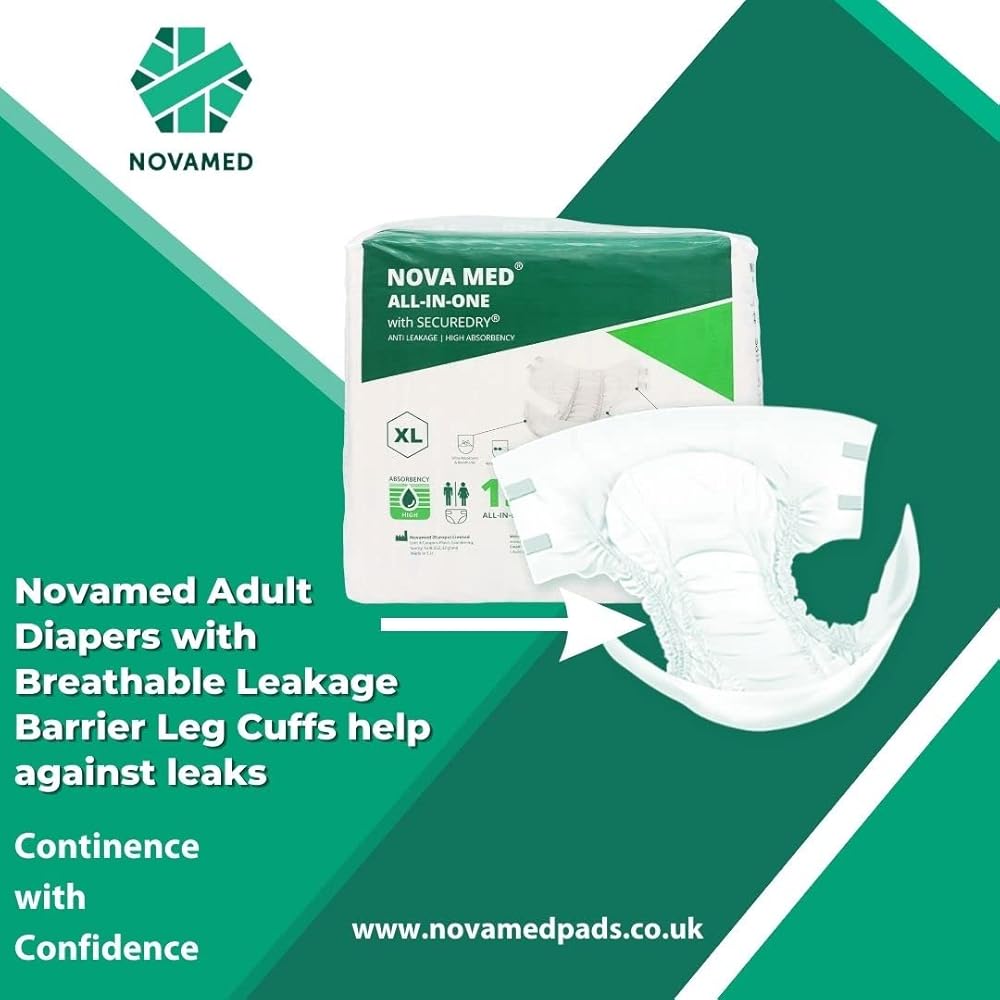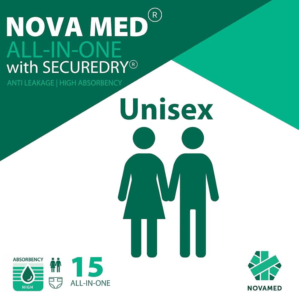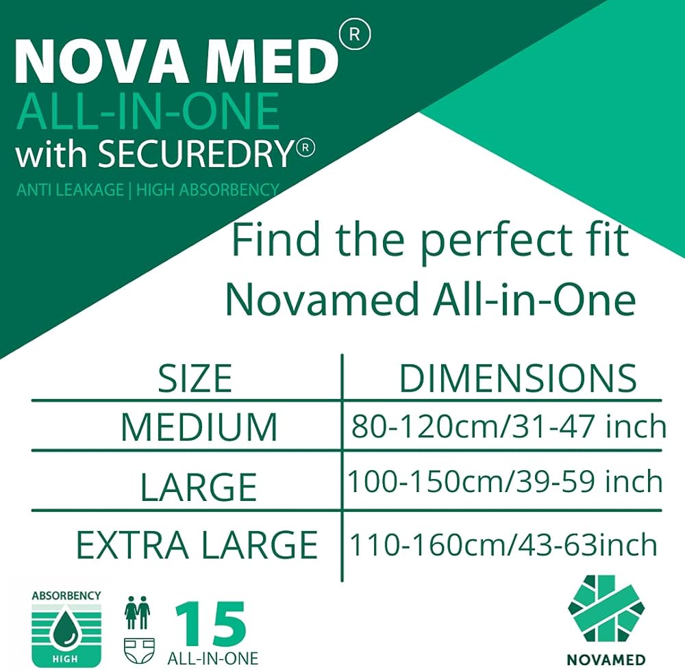 سرية ومريحة - حفاضات للبالغين الكل في واحد من نوفاميد / حفاضات البالغين مصنوعة من قماش غير منسوج مريح وجيد التهوية لا يسبب الحساسية وخالي من اللاتكس ولطيف على البشرة ولا يصدر أصوات مكشكشة أثناء المشي أو الجلوس. مقاس الخصر XL – 110 – 160 سم (43 – 63 انش)، عبوة من 15 قطعة