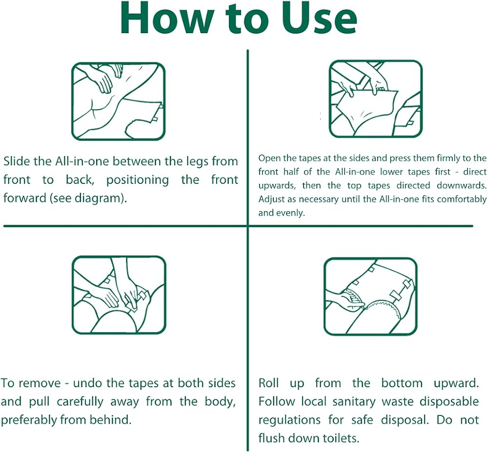 تصميم للجنسين وسهل التخلص منه - تم تصميم الحفاضات / الحفاضات / الانزلاق لكل من الرجال والنساء. خالية من اللاتكس ومناسبة لسلس البول الثقيل و/أو البراز.