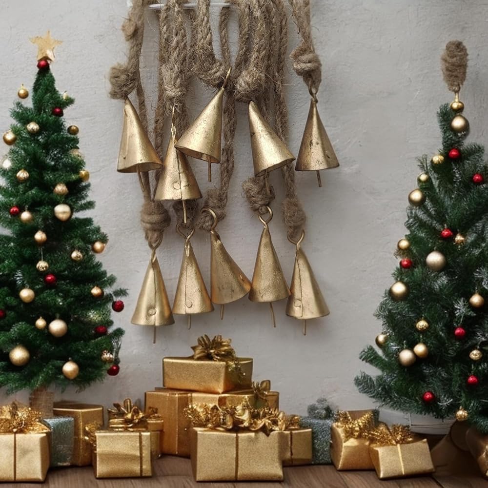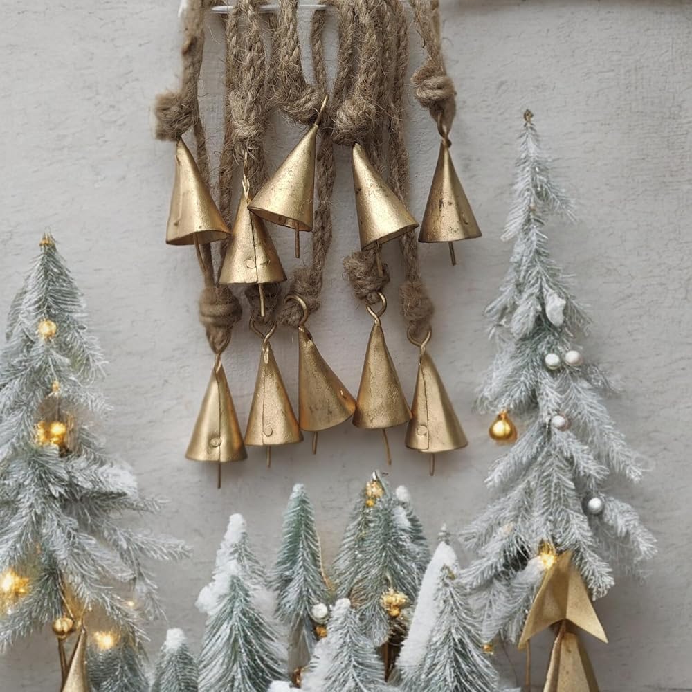 Small Vintage Rustic Lucky Tin Metal Cow Bells Handmade Christmas Décor Bells on Jute Rope 4cm (Pack of 10, Cone-Cylinder)