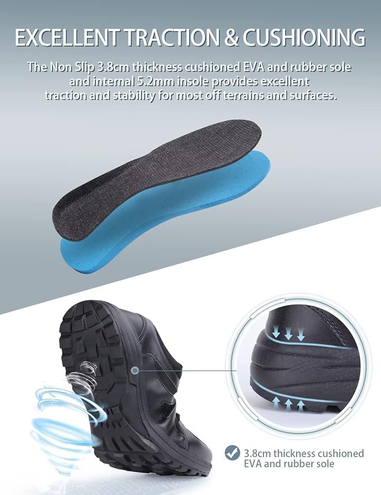 • ★احتكاك وتبطين ممتازين: يمتص النعل المطاطي المبطن الصلب غير القابل للانزلاق بسمك 3.8 سم التأثير من خلال مزيج من التوسيد ومقاومة الضغط، مما يوفر احتكاكًا وثباتًا ممتازين لمعظم التضاريس والأسطح.