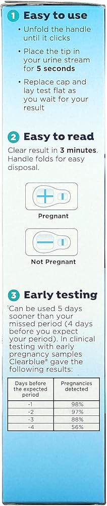 أكثر من 99% دقيقة من اليوم الذي تتوقع فيه الدورة الشهرية* نتائج قابلة للطي بالحجم الكامل قبل 5 أيام¹ مع تقنية الحماية من الفيضانات للمساعدة في تقليل خطأ الاستخدام² قابلة للطي لسهولة الاستخدام والتخلص منها، طرف عريض للغاية يتغير اللون لسهولة أخذ العينات واضح + أو - نتائج سهلة القراءة واضحة في 3 دقائق. يمكن طي المقبض لسهولة التخلص منه. (+) الحوامل (-) الفحص المبكر لغير الحوامل ¹يمكن استخدامه قبل 5 أيام من الدورة الشهرية الضائعة (4 أيام قبل توقع الدورة الشهرية). في الاختبارات السريرية مع عينات الحمل المبكرة، أعطت كلير بلو النتائج التالية: قبل أيام من الفترة المتوقعة. تم اكتشاف حالات الحمل - 1 98% - 2 97% - 3 88% - 4 56% *>99% دقيقة في الكشف عن مستويات هرمون الحمل النموذجية. لاحظ أن مستويات الهرمون تختلف. انظر الحشو. ¹انظر جانب اللوحة ²البيانات الموجودة في الملف