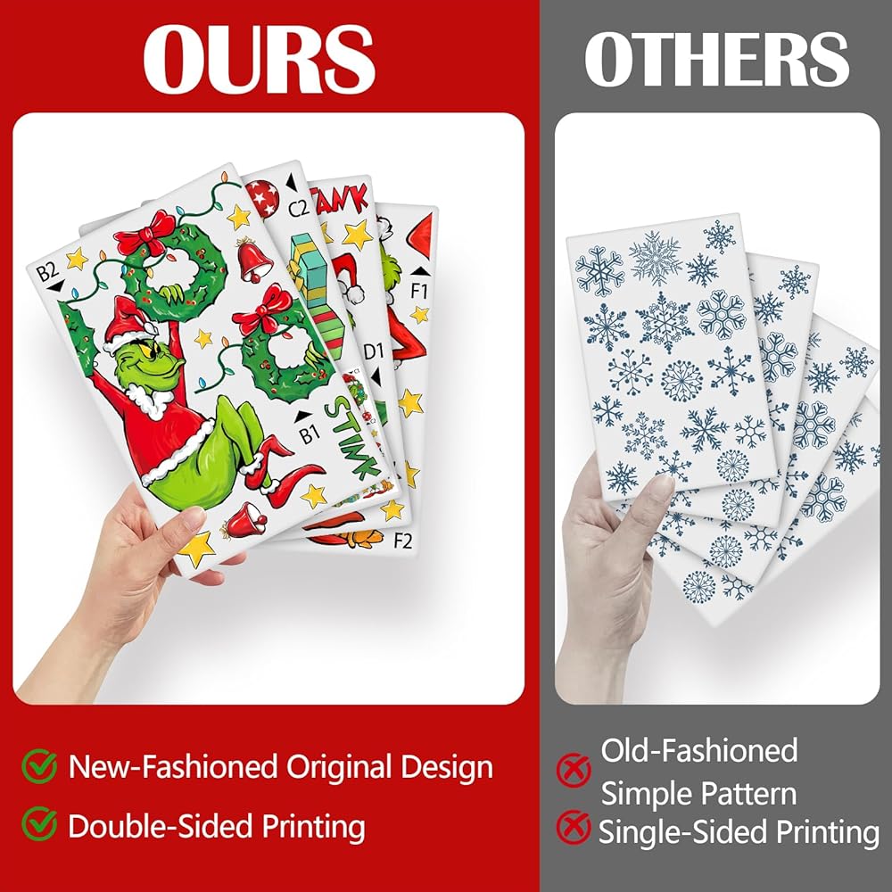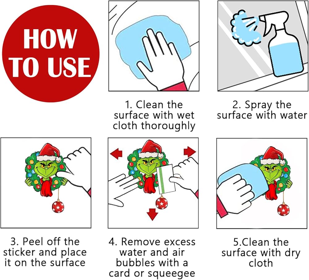 ديكور منزلي بدون لاصق: ديكورات نوافذ عيد الميلاد هذه عبارة عن ملصقات ثابتة رفيعة، والتي لا تتطلب غراء أو شريطًا إضافيًا، ويمكن ربطها بسهولة بسطح أملس وجاف. ما عليك سوى إزالة ملصق النافذة ولصقه على سطح السيارات والشاحنات والزجاج والمرايا والنوافذ والأبواب الزجاجية المقاومة للتخريب وأسطح الحمامات؛ واستخدم بطاقة لإخراج فقاعات الهواء من الأعلى إلى الأسفل. من السهل تركيبها على نافذتك وإزالتها دون ترك بقايا لزجة