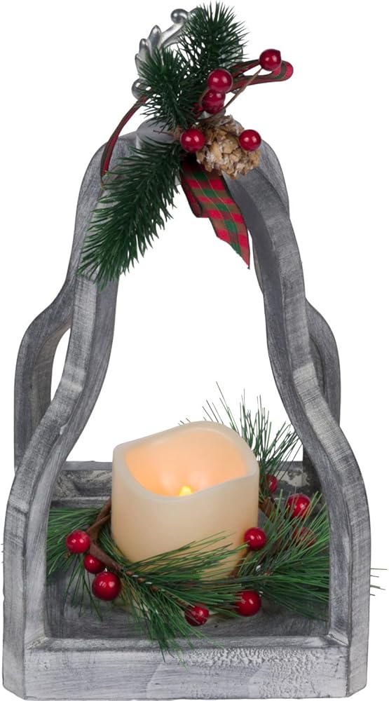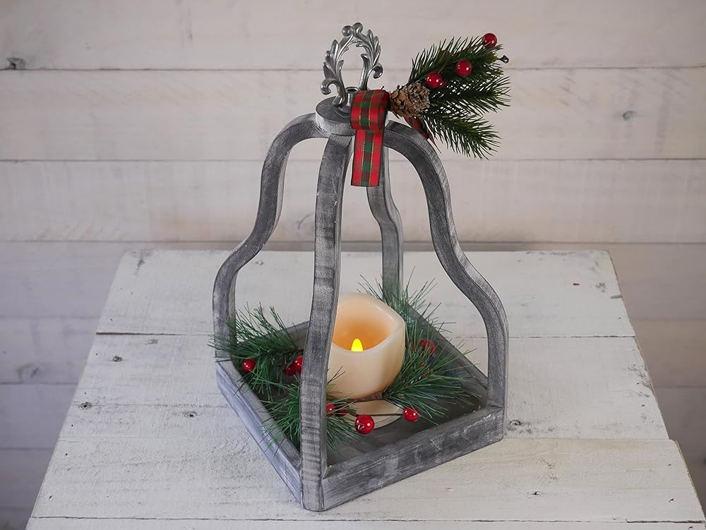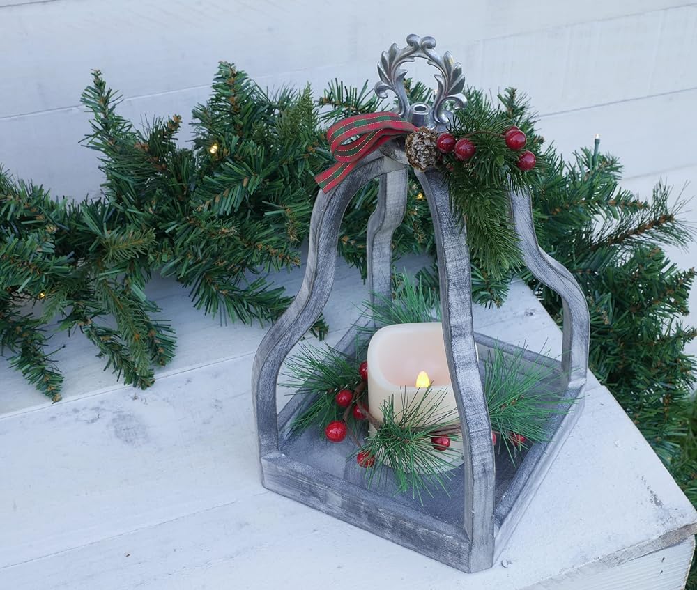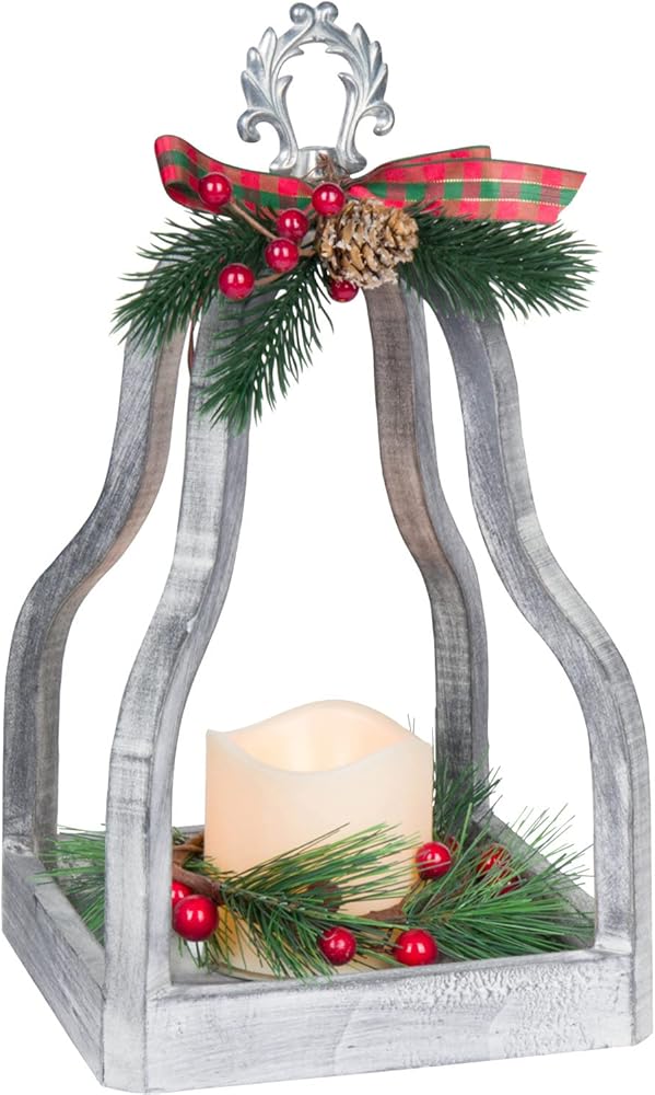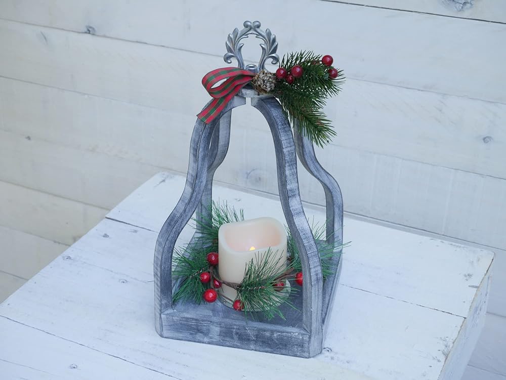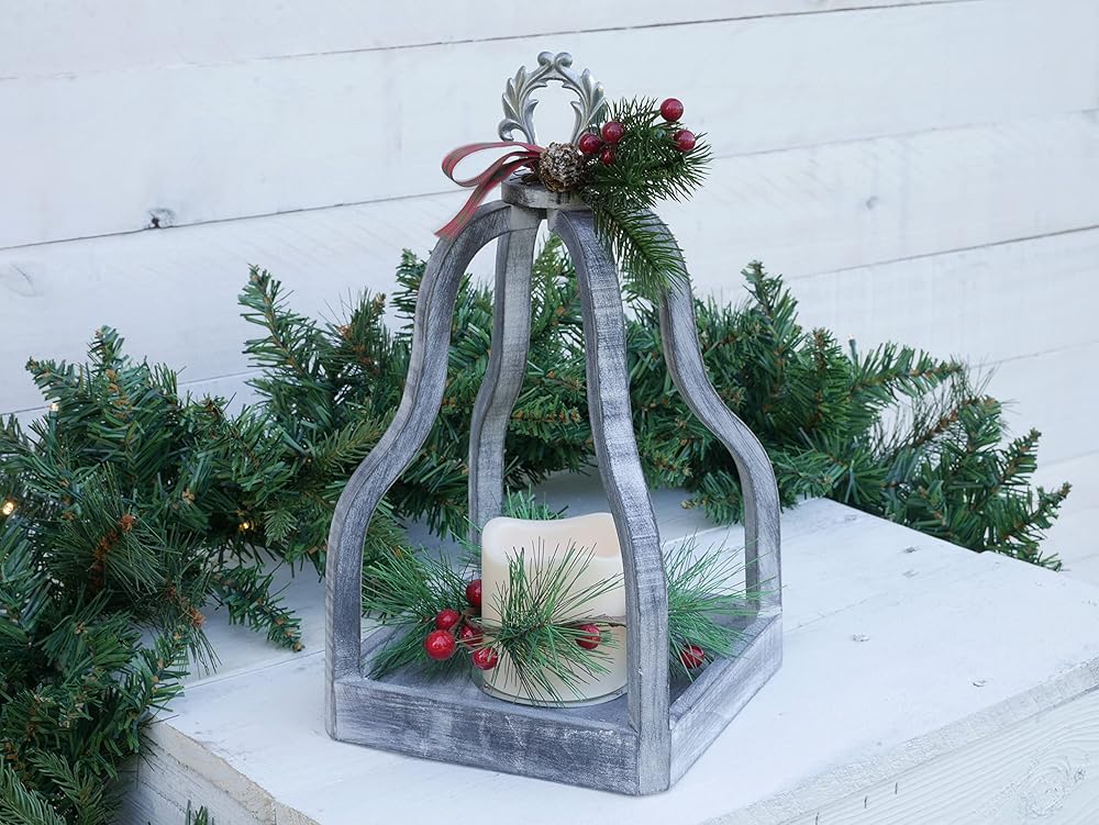 فانوس عطلات خشبي أبيض مضيء مقاس 13 انش مع المساحات الخضراء الصناعية والتوت والفيونكة المنقوشة سيضيف لمسة احتفالية للكريسماس إلى ديكور منزلك. يتميز بجزء علوي معدني فضي وشمعة LED بمؤقت يعمل بالبطارية