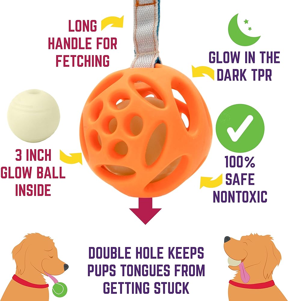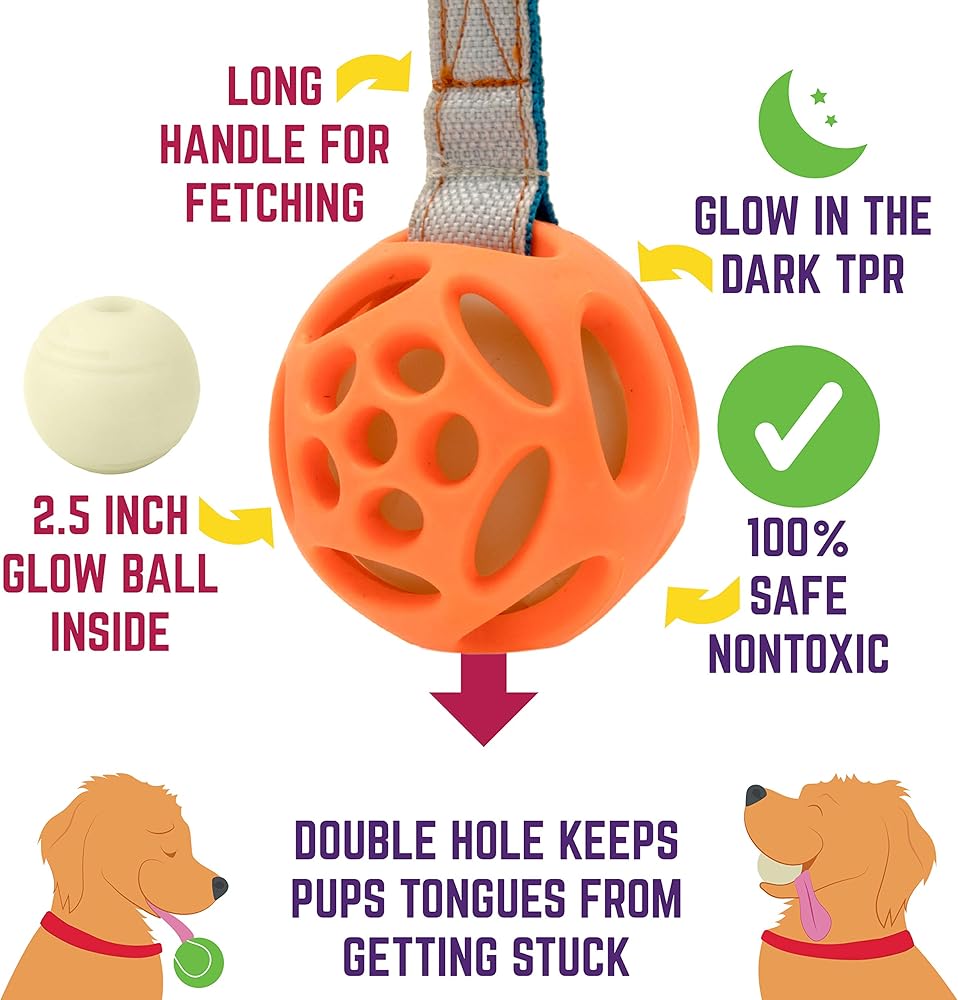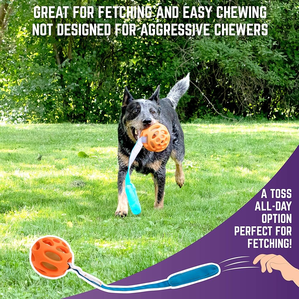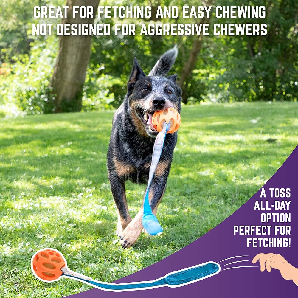 تتضمن 3 كرات مطاطية طبيعية متينة، 1 كرة إحضار متوهجة في الظلام، 1 قاذف كرات