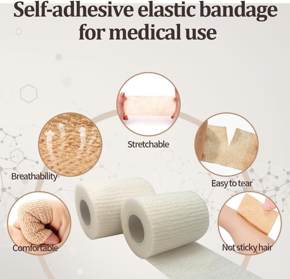 • متعددة الأغراض: يمكن استخدام أغلفة الضمادات ذاتية اللصق على المعصمين والركبتين وأجزاء مختلفة من الجسم للحماية أثناء التمرين، ولتقديم المساعدة لسلالات العضلات والمفاصل المتورمة، ولرعاية الحيوانات الأليفة والحيوانات.