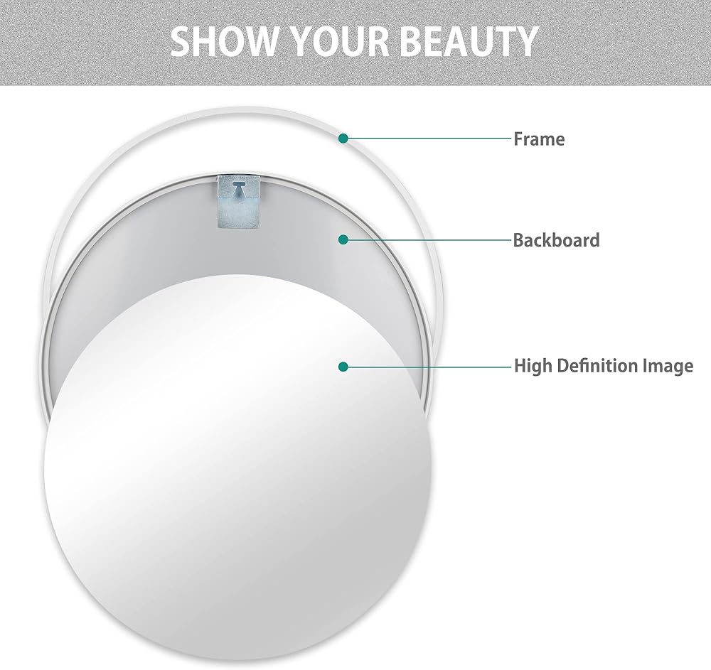 عملية ومتينة: المرآة الدائرية الخلفية مع غراء مقاوم للعفن البيئي لتحقيق تأثير مقاوم للماء والرطوبة. يمكنه تحمل تغيرات درجة الحرارة والرطوبة لذا فهو مثالي للتعليق في الحمام. مقاوم للرطوبة بشكل دائم ويمكن أن يبقى دون تغيير مع مرور الوقت.