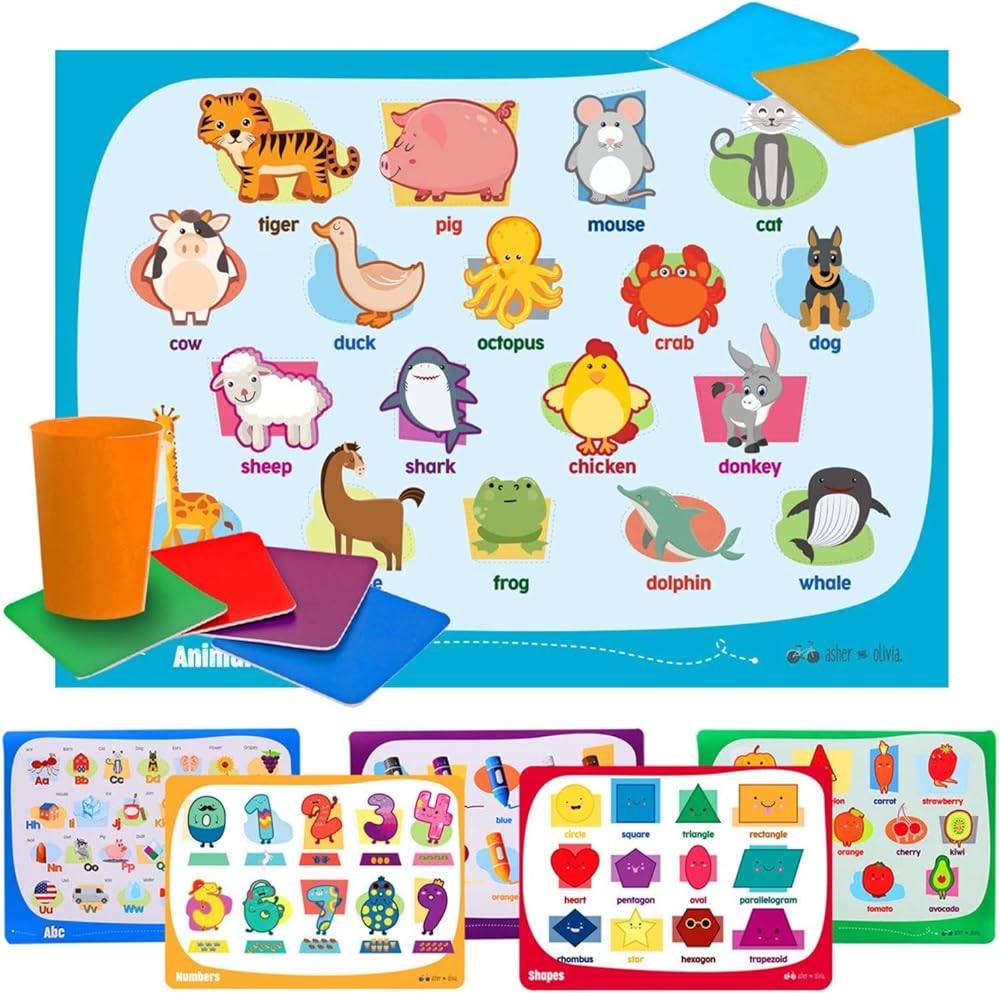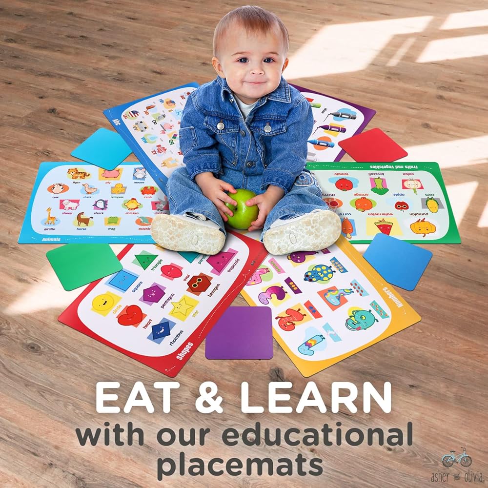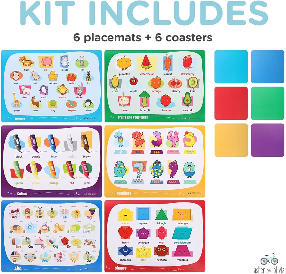 تصميمات تعليمية: هذه المفارش التعليمية للأطفال مثالية لأي طفل يحب التعلم. تتضمن المفارش التعليمية للأطفال 6 تصميمات تعليمية صورًا للحيوانات والفواكه والخضروات والألوان والأرقام والأبجدية والأشكال لإبقاء طفلك مشغولًا. مجموعات فريدة من نوعها من 6 مفارش تعليمية للأطفال و6 قواعد أكواب للمشروبات ستخلق مجموعة متنوعة في روتين طفلك الذي سيبقيه مستمتعًا كل يوم.