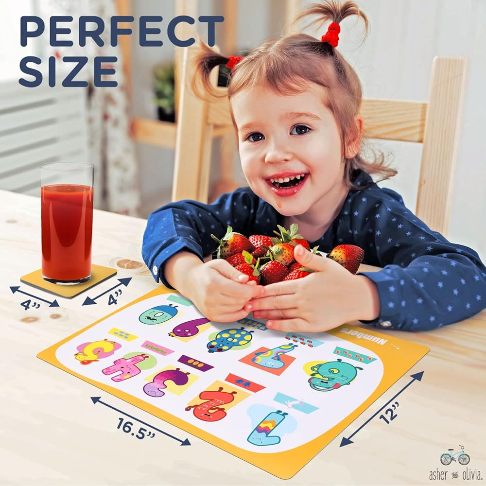 مقاس مثالي: تتضمن مجموعة مفارش الأطفال هذه 6 مفارش طاولة طعام للأطفال بتصميمات تعليمية و6 قواعد أكواب رائعة وملونة ستبقي الأطفال الصغار مستمتعين أثناء تناول الطعام. مع مساحة سطح كبيرة 16.5 انش × 12 انش، يمكن لمفرش الأطفال الصغار حمل أي شيء قد يحتاجه طفلك في وقت وجبته. قواعد أكواب ملونة مقاس 4 انش × 4 انش تأتي مع مفارش للأطفال ستحمل كوب طفلك بأمان. مفارش طاولة الطعام للأطفال الصغار هي الحجم المثالي لأخذها معك في أي مكان!