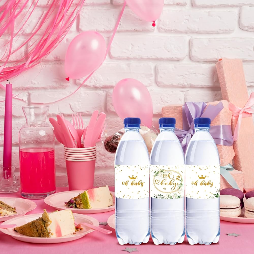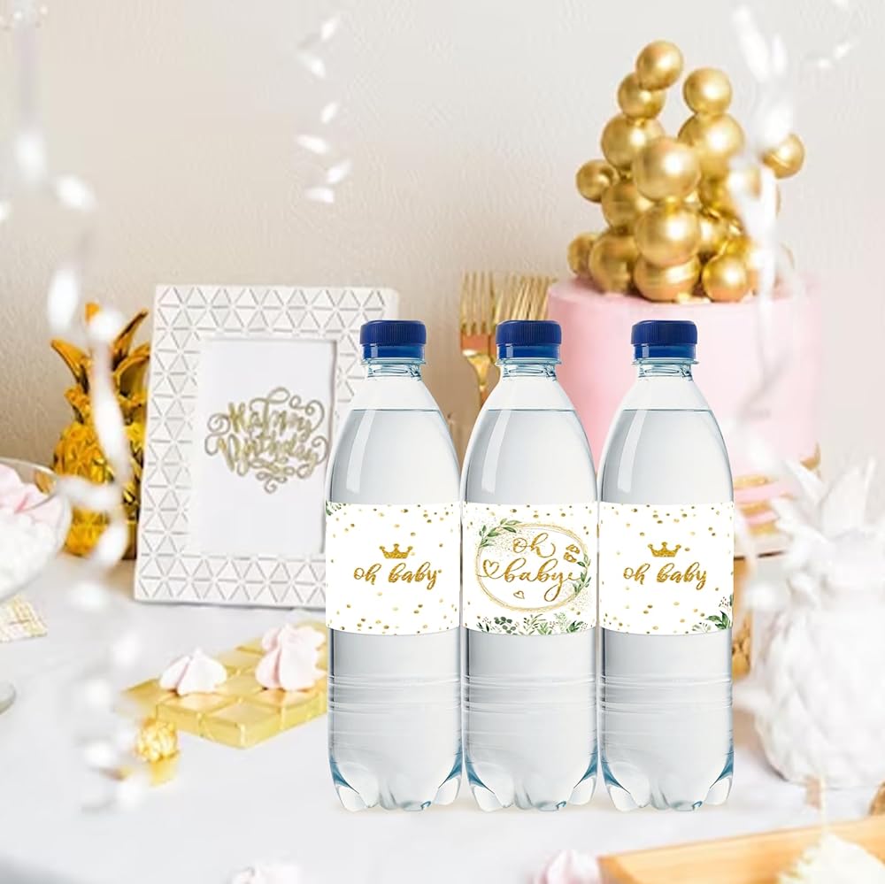 ملصقات زجاجات المياه من جرينيري اوه بيبي، اغلفة زجاجات اطفال ذهبية لامعة للكشف عن جنس المولود، ملصقات زجاجة مياه اوكالبتوس للاولاد او البنات، ديكورات حفلات عيد الميلاد الاول - مجموعة من 32 قطعة