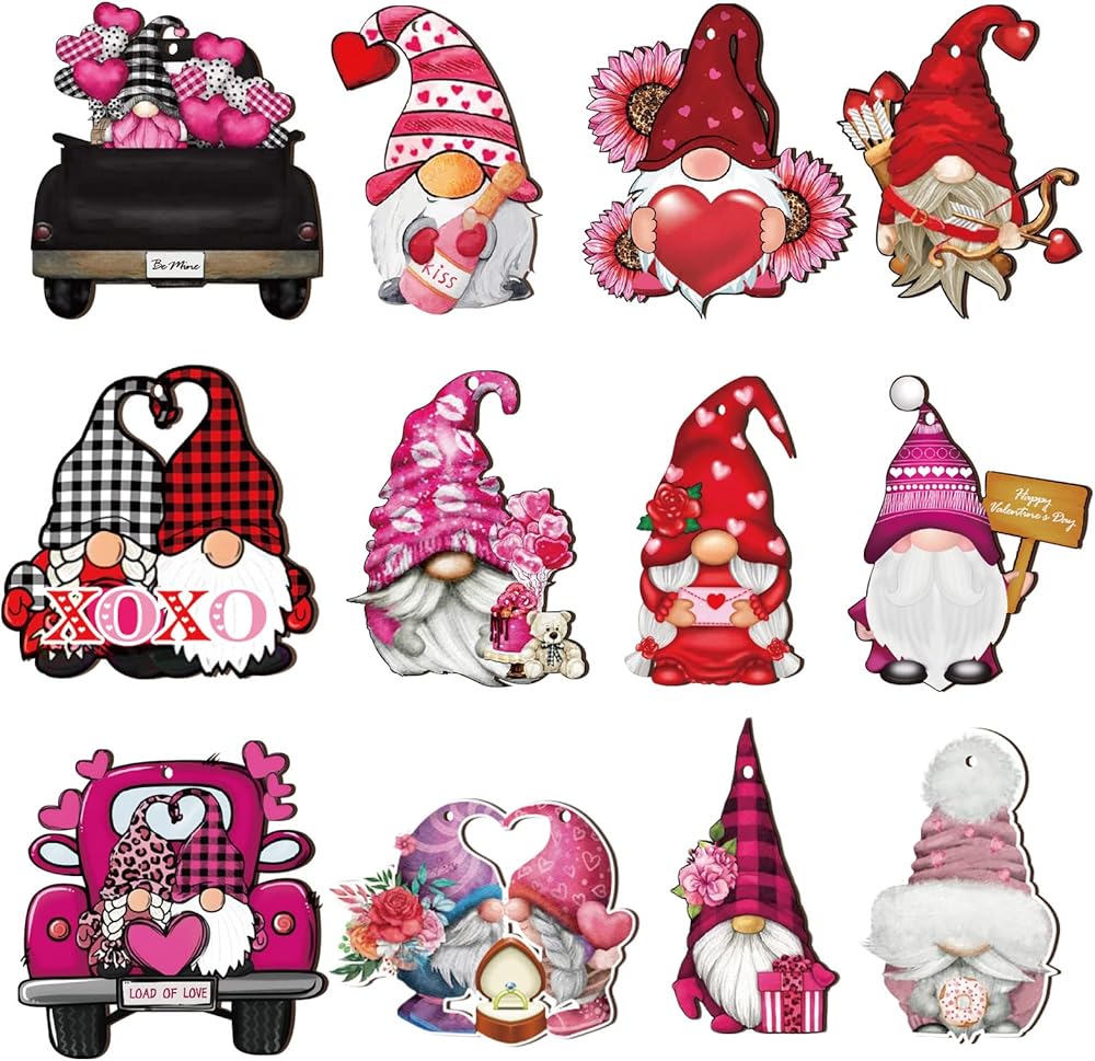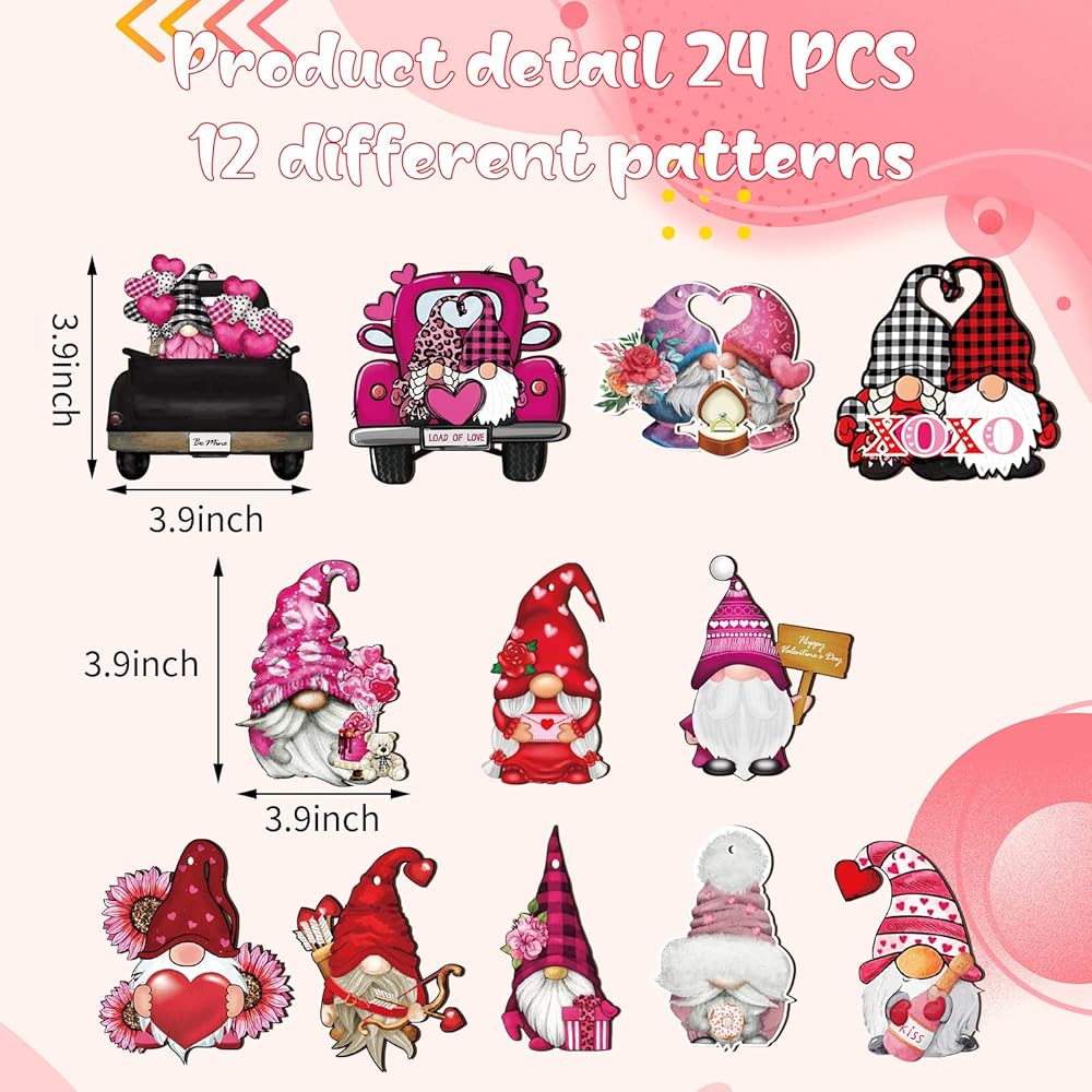 Unique Valentine's Gnome Decoration Set - 24 Pieces Gnome Wooden Ornaments in 12 different styles. Add more romantic details to your home with classic Valentine's Day elements such as XOXO letters, plaids, trucks, hearts and more