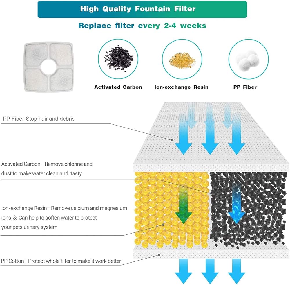 • 🐾【مفيد للصحة】يمتص الكربون النشط الكلور والغبار لجعل الماء نظيفًا ولذيذًا؛ يعمل راتنج التبادل الأيوني على إزالة أيونات الكالسيوم والمغنيسيوم، وينعم الماء لحماية الجهاز البولي للحيوانات الأليفة.