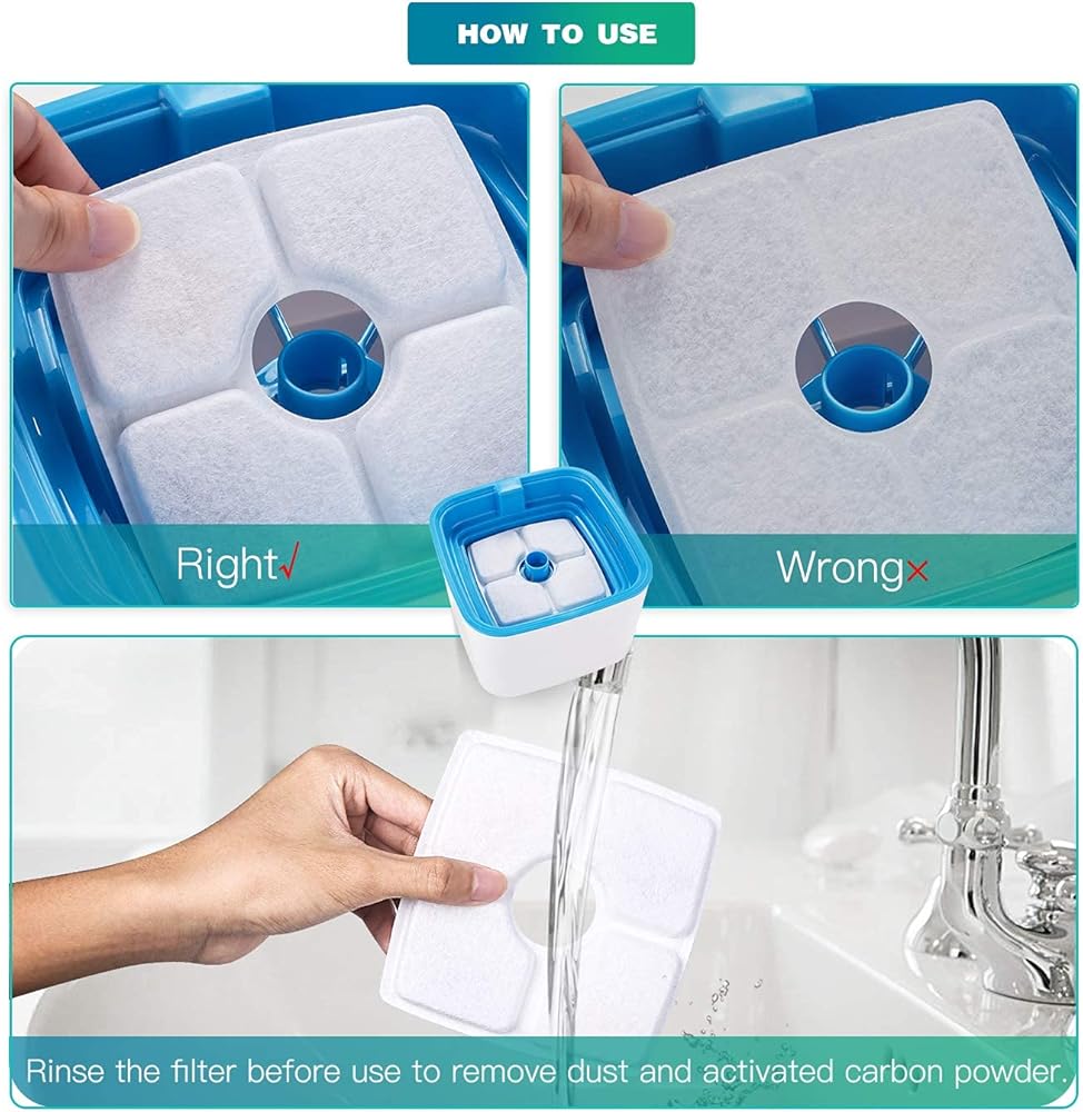 • 🐾【عمر طويل وبأسعار معقولة】يوصى باستبدال الفلتر كل أسبوع أو أسبوعين يختلف عن حالة الاستخدام الفعلية. 8 عبوات يمكن أن توفر مياه نظيفة لمدة 2 إلى 4 أشهر. قبل الاستخدام، يجب شطف الفلتر تحت الماء الجاري لطرد مسحوق الكربون الإضافي. من المعتاد دائمًا تنظيف النافورة والمضخة باستخدام فرش التنظيف المتضمنة عند الحاجة.